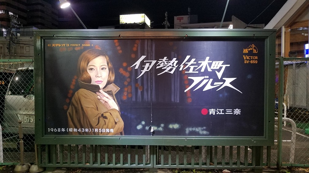 「伊勢佐木町」という名前を有名にした曲を記念した歌碑は、イセザキモールを関内駅方面からかなり進んだ場所にあります。青江三奈さんはリアルタイムでは知りませんでしたが、独特の歌声で親世代には人気の大歌手とのこと。昭和感たっぷりのレトロな看板が印象的です。