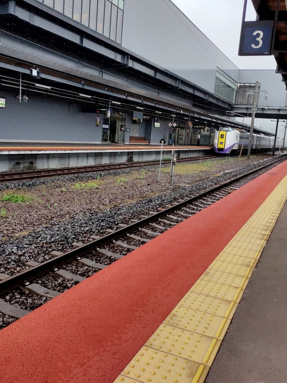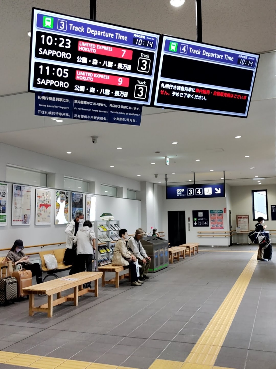 現在新幹線の終着駅になっている駅です.新幹線の開業に伴って駅舎が新しくなり,快適な施設になりましたが,周辺にはまだ特に何もありません.今回は札幌行きの特急北斗に乗車するために利用しました.ホームの場所が動物の絵で示されている点が北海道らしいなと思いました.新幹線で来た場合,函館へ向かうためにもこの駅から乗り換えます.電車の中で飲むための飲み物を買おうとKIOSKを探しましたが,一端改札口を通ってしまうと,新幹線の方にしかKIOSKが無いようで,自販機で購入しました.食べ物を買いたい人は,事前に購入しておいた方が良いかも知れません.