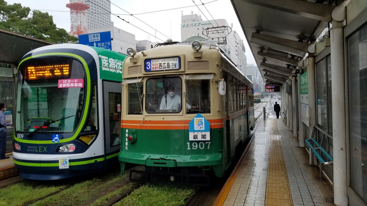 広島電鉄の路面電車は、市街各地、宮島を結ぶ8路線からなり、市民の足として親しまれ「広電」と呼ばれています。路線延長、利用者数ともに日本一を誇るだけでなく、レトロから最新型まで種類豊富な車両が魅力あります。広島駅前から原爆ドーム前までの往復での利用、車窓の繁華街の景色とともにバラエティに富んだ車両を楽しめました。