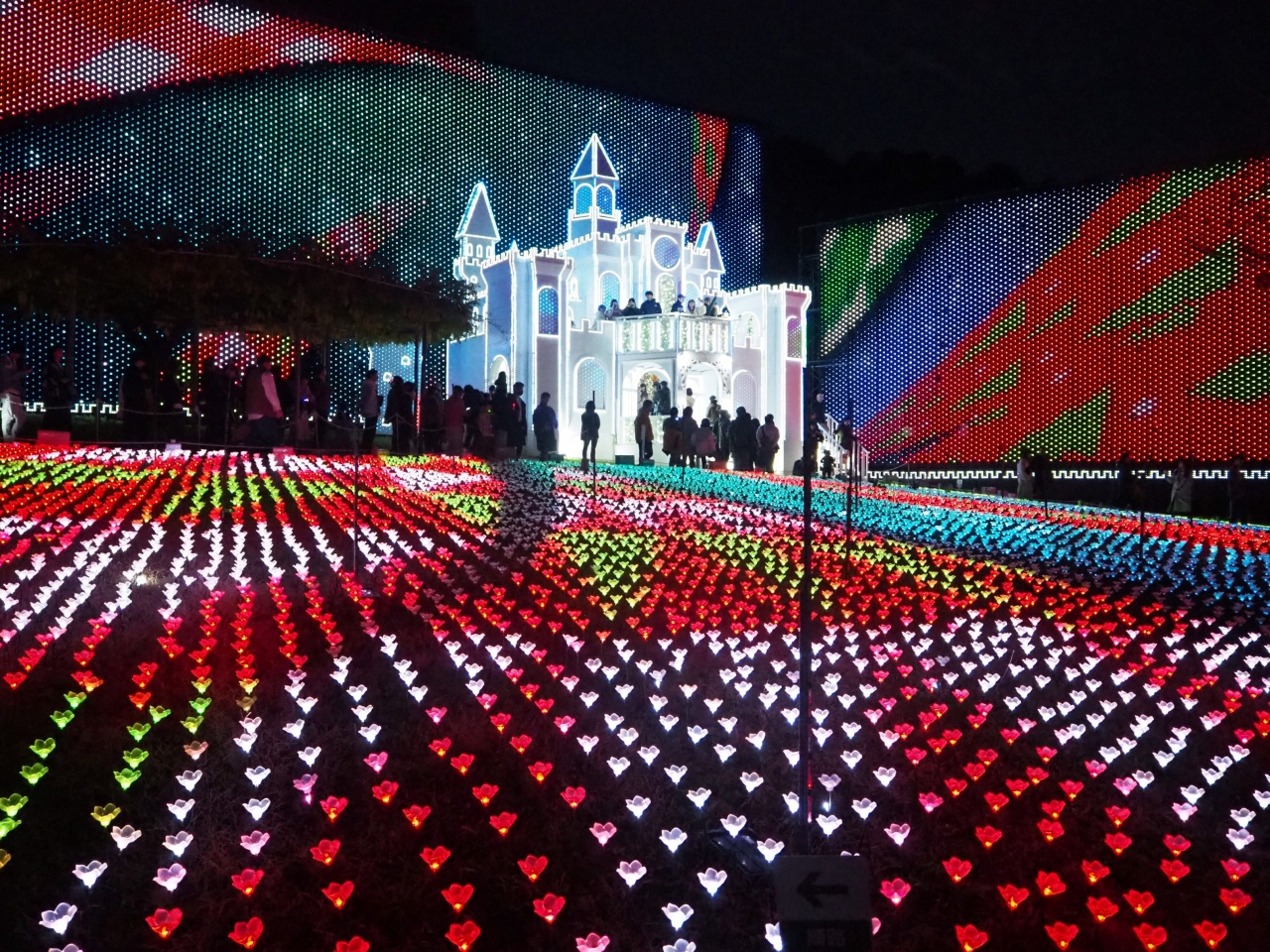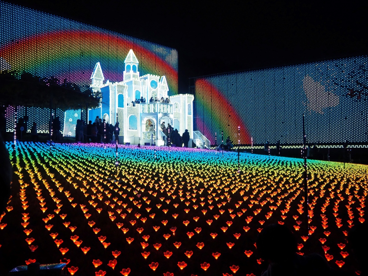 イルミネーションは季節により演出が変わり、クリスマスファンタジー(11月下旬から12月下旬)の時期。フラワーキャッスルのプロジェクションマッピングもクリスマス中心。カラフルで華やかでした!