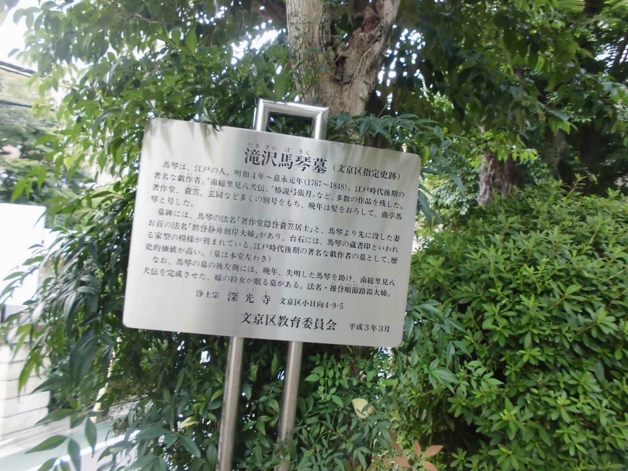 滝沢馬琴(ウィキペディアでは曲亭馬琴)と言えば南総里見八犬伝の作者として知られています。そのお墓です。茗荷谷にある深光寺というお寺にあります。墓碑には本人と妻の墓があり「歴史的価値が高い」と書いてありました。ここに滝沢馬琴の墓があると知れたのは良かったです。