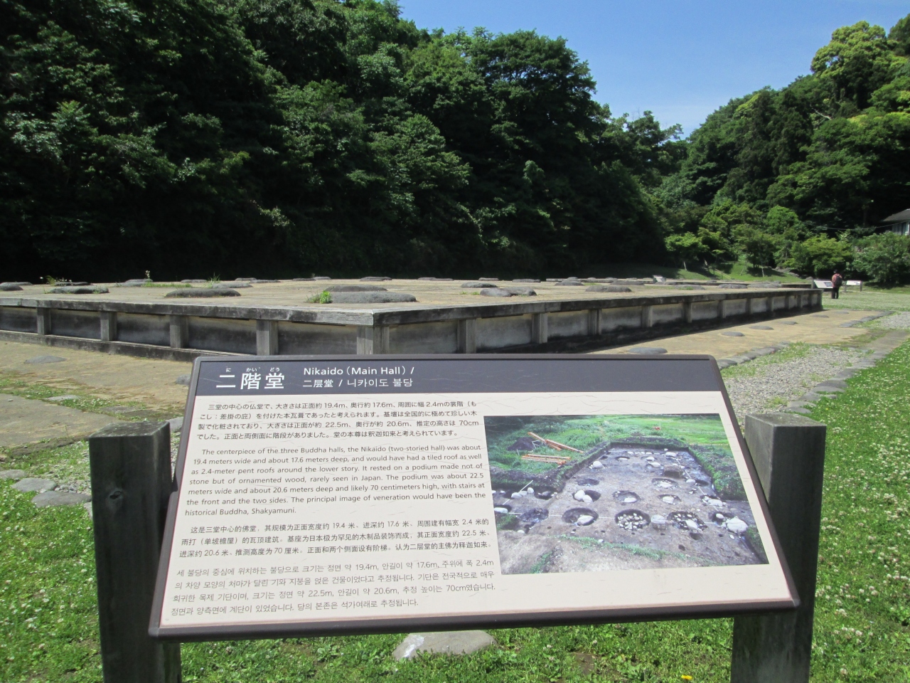 本日は鎌倉殿13人の関係するスポットの一つとしてここに寄りました。近辺に居を構えた藤原行政は地名になった二階堂を称し、二階堂行政と呼ばれました。行政は母方が頼朝と同じ熱田大宮司家で、京都で財政のキャリアを積んだ実務官僚で、13人重臣の一人です。永福寺跡は国指定史跡です。源頼朝が奥州藤原氏を滅ぼした後、源義経、藤原泰衡、数万人の将兵の鎮魂のために、中尊寺の二階堂(大長寿院)を模倣した大伽藍の永福寺を建てました。発掘調査の結果、阿弥陀堂、二階堂(二階建てから二階堂と言われる)、薬師堂、池、橋、庭園の配置が明らかになり、盛土をして遺跡を保護し、その上に基壇、礎石を再現しています。CGによる復元図を見ると、池を含めた伽藍の壮大さ、建屋の大きさが伺えます