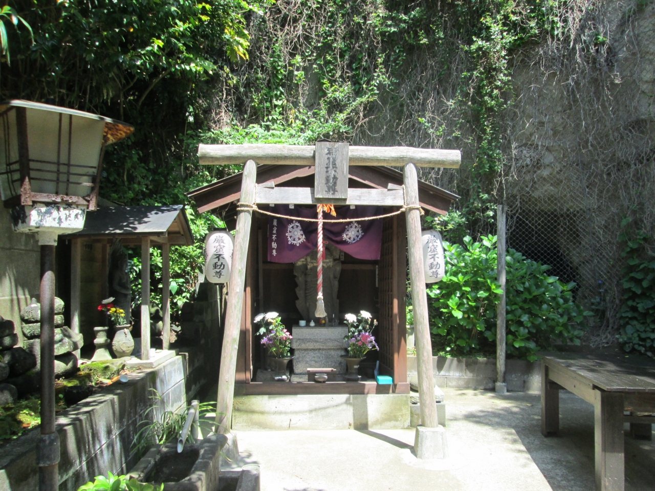 鎌倉駅の西を走る今小路を北に進み、英勝寺手前の道を右に折れ、横須賀線を渡りすぐ左手不動茶屋の奥にあります。または小町通りを北に進み、鉄の井を左に曲がりしばらく行くと右手不動茶屋の奥にあります。鎌倉殿13人とは関係ありません。創建は不詳、源頼朝が鎌倉入りする前にはあったと伝えられる、本尊は不動明王です。当初、不動明王はやぐら内部の壁に浮き彫りされていましたが、風化が激しく新しく彫られた石造が祀られています。崖下に 鳥居と堂宇と不動明王があります。時代的に新しい庚申供養塔が数基もあります。付近に散在していた庚申塔を集積したのでしょうか? 門柱に巌窟不動尊という表札が無いと、お茶屋さんと思い入り難い場所です