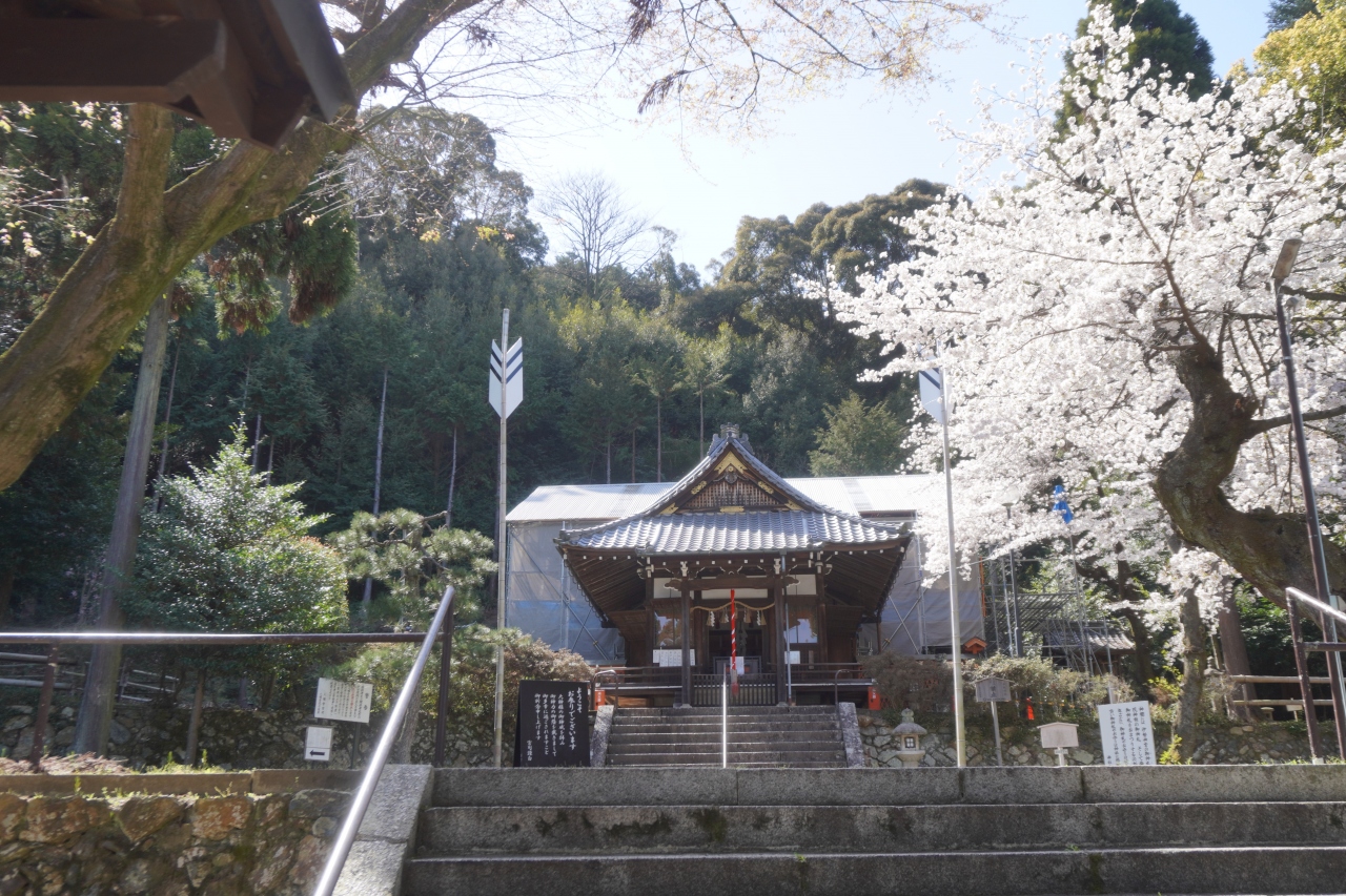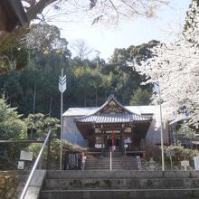 赤い鳥居を入って、ぐるっと回り込むようにして上の本殿に向かって石段が続きます。本殿は工事中でしたが、見える部分だけ見ても切妻造平入の本殿は金の金具が豪華だし、それなりの威厳を感じます。