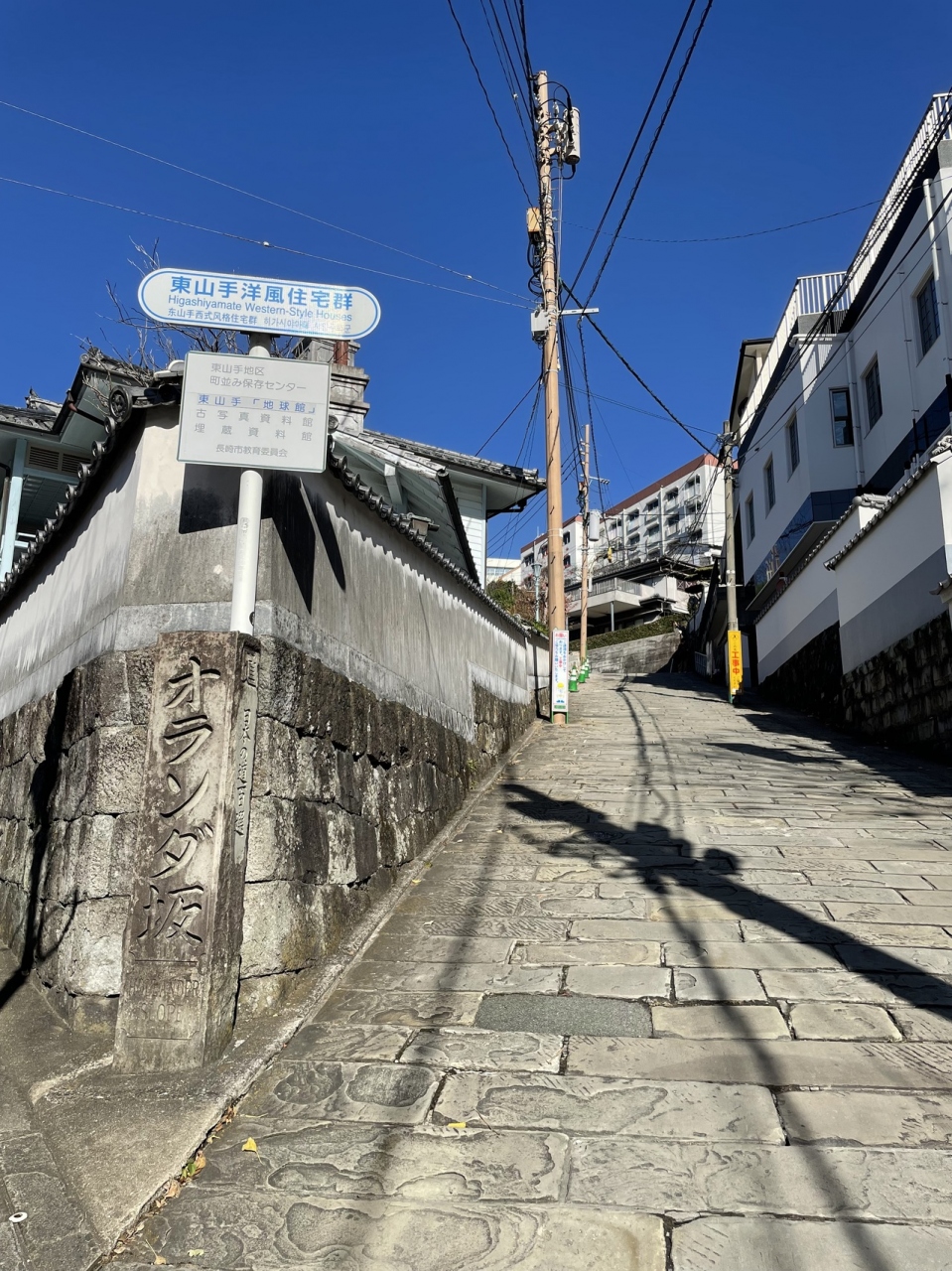 活水女子大学の下を通る石畳の続く坂です。洋風建築が並び、異国情緒を感じることができる東山手エリアにあります。観光客の散策も多いですが、地元の生活道路でもあります。坂を超え反対側に出ると市電の石橋電停に至ります。