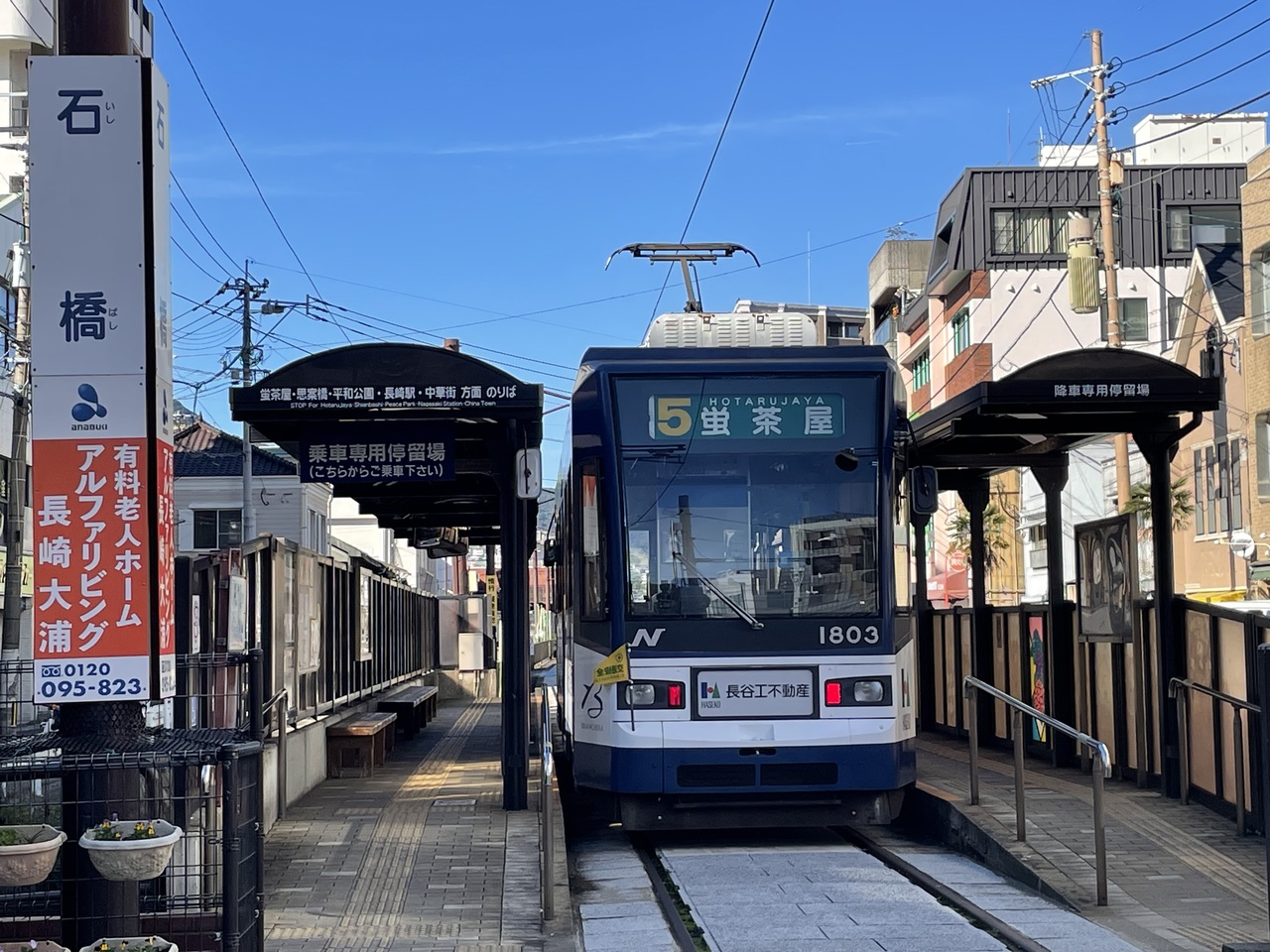 長崎市内に路線をもつ路面電車ですが、私鉄になります。大浦支線の終着駅である石橋は単線区間ではありますが、日中でも9分間隔と比較的に本数は多いです。到着するとすぐ折り返していきます。運転系統は5系統で蛍茶屋とを結んでいます。