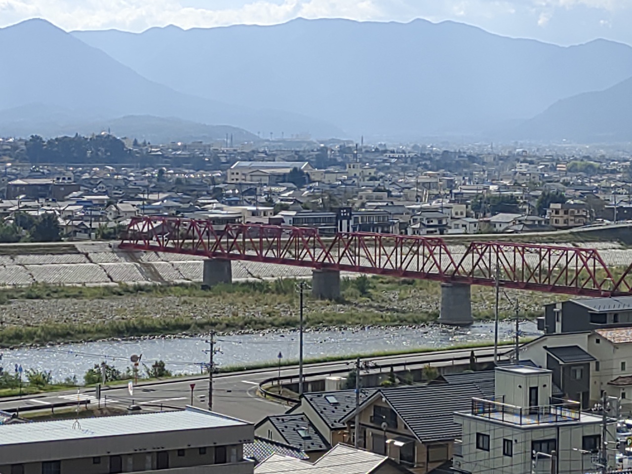 鮮やかな赤い橋が目立っていました。台風の前にも来たことがあり、台風で壊れてしまっていた時にも何度も来ました。上田電鉄の橋で、壊れていた間は、バスで次の駅までピストン輸送していました。復興され、赤い橋が再びよみがえって、感無量です。良かったです。