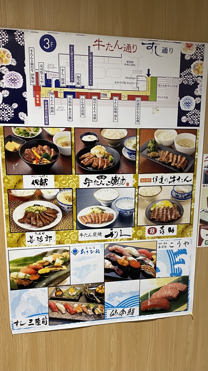 JR、地下鉄、東北新幹線の大ターミナルです。駅構内3階に牛タン有名店の集まる牛タン通りとすし通りと、最近ずんだ餅商品を扱うずんだ小径もできました。2階には大きな催事場があり、各地の物産展をやってました。