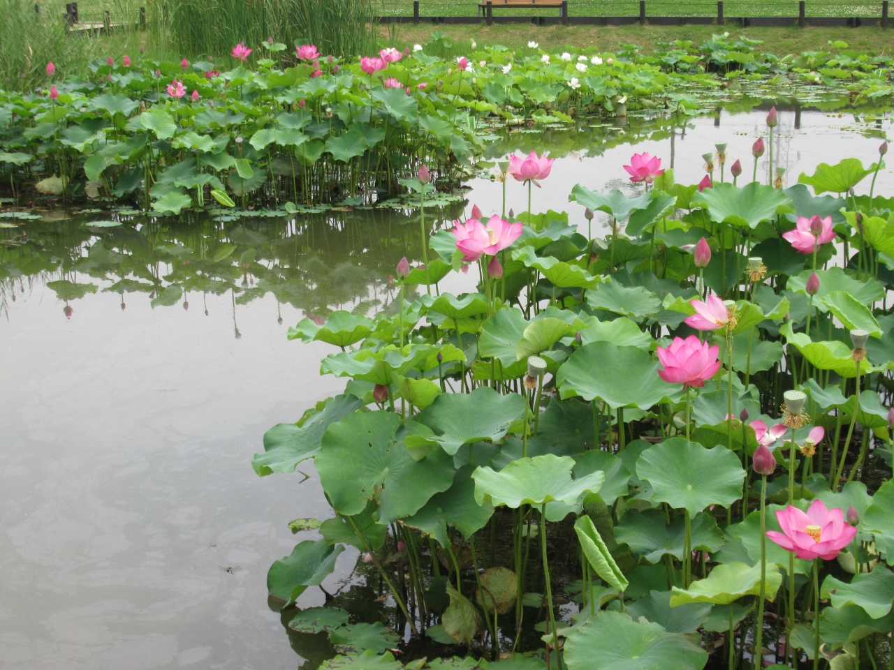 平日午前、散策するために車で舎人公園へ行きました。舎人ライナーの舎人公園駅が最寄り駅です。舎人公園交差点の道路で、舎人公園は4つのブロックに分かれています。車を停めたAブロックの第一駐車場そばにテニスコート、ドッグラン、陸上競技場があります。Bブロックが一番広く、大池を中心として桜が植えられているお花見広場、キャンプ広場、珍しいソリゲレンデ、ロープ遊具のある児童遊園などがあります。Cブロックはバーベキュー広場と売店、自然観察園、ハス池、いくつもの砦がある冒険の丘、乳幼児専用の遊園などがあります。Dブロックにナイター設備のある野球場があります。蒸し暑い日だったからか、どの児童・幼児遊園も1組くらいしか遊んでいませんでした。ソリゲレンデでお父さんと子供たちが何度も滑って楽しそうでした。ハス池の白とピンクのハスがきれいだったことと、大池のそばの草地で6羽のカモが人を気にせず歩いていたのが印象的でした。自宅の近くだったら散歩や、孫と遊びに何度も行きたい公園です。