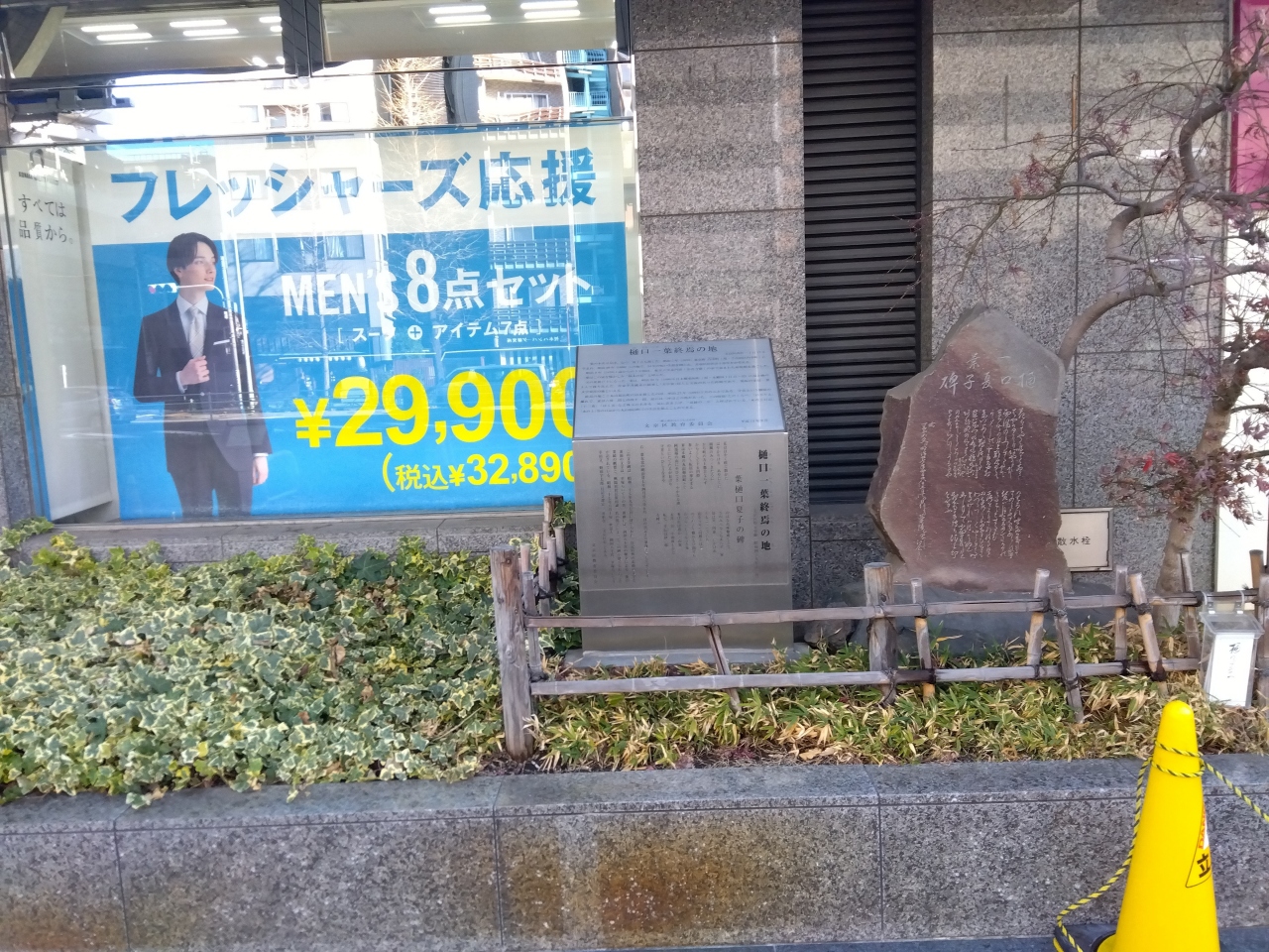 樋口一葉終焉の地は春日駅から徒歩数分の所にあります。今は石碑のみです。紳士服のコナカの脇にあります。今は大通りに面していますが、当時はもっと静かだったと思います。五千円札の顔でお馴染みの樋口一葉の終焉の場所で碑と説明文があります。