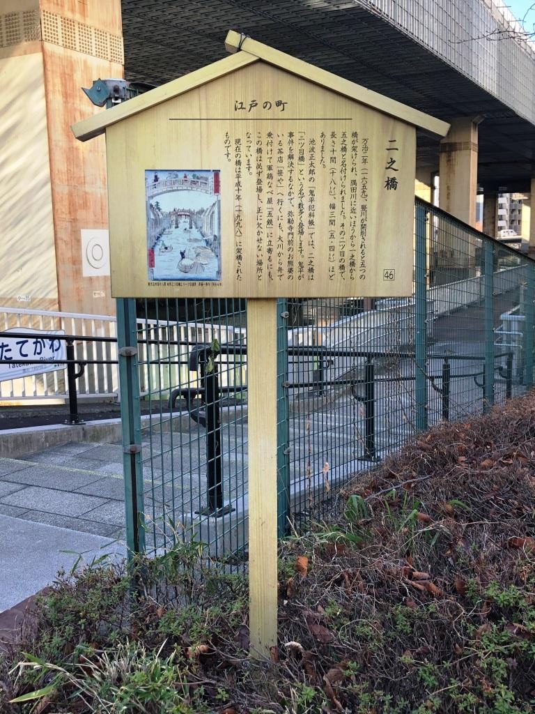 「二之橋跡」は、墨田区両国4丁目付近にあります。「二之橋跡」へのアクセスは、都営地下鉄大江戸線「両国駅」のA5番出口出て、左方向に進みます。「京葉道路」を渡り、200mほど直進すると「首都高速7号小松川線」があり、その下の「二之橋」の袂の右側に「二之橋跡」の高札あります。