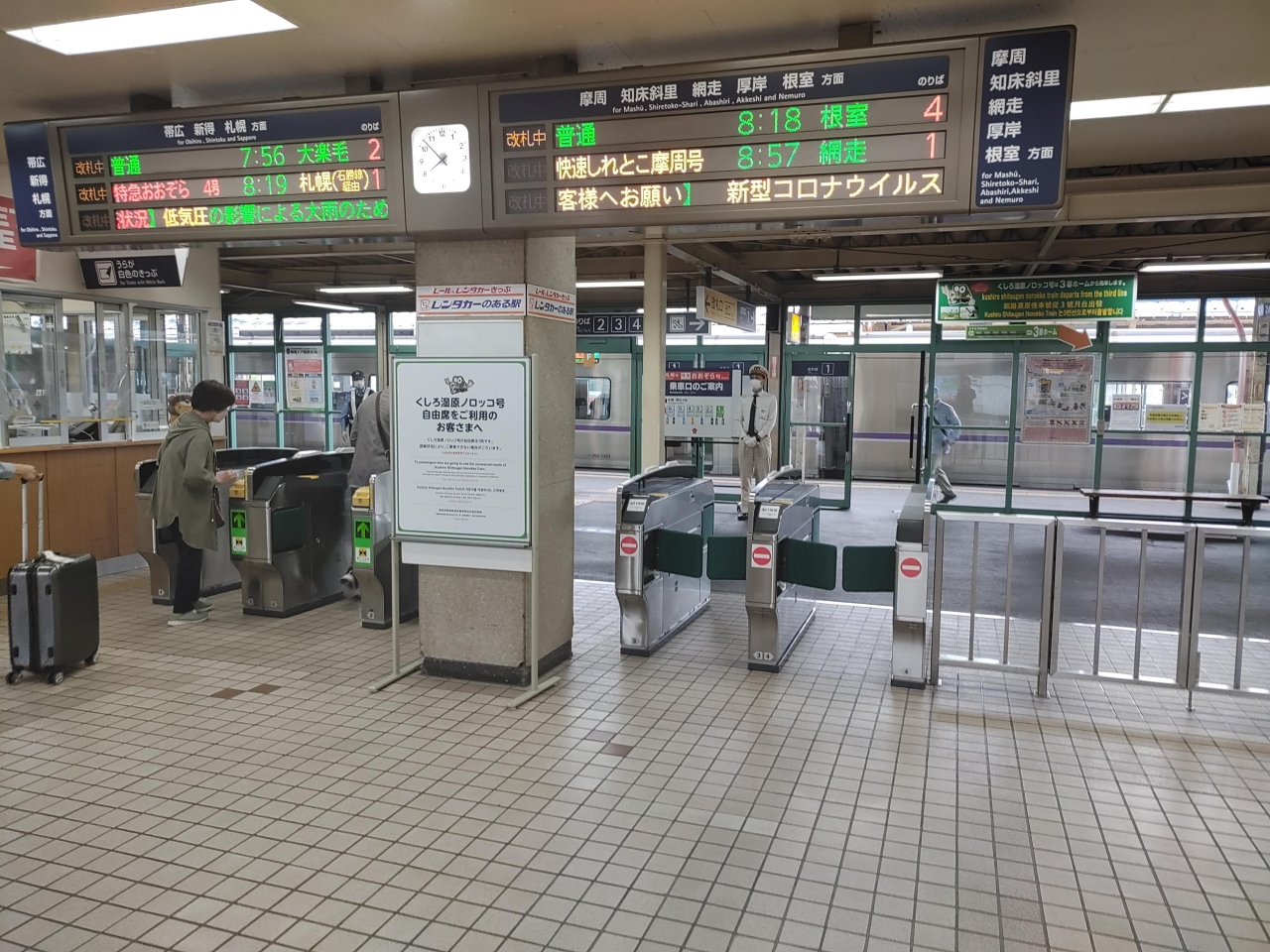 道東の中心となる駅です.札幌から根室本線の特急で直接来ることができます.また,ここから根室までの根室本線は花咲線と呼ばれる路線で,風光明媚な景色が続きます.更に,釧路湿原方面へは,釧網本線で網走まで行くことができます.こちらもとても景色が綺麗でした.北海道のJR路線はなかなか経営が厳しいようですが,とても重要な観光資源だと思うので,是非これからも存続して欲しいです.