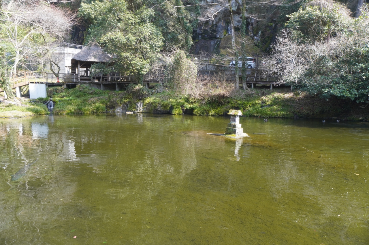 おのころ池は、真名井の滝周辺の遊歩道が始まる辺り。イザナギとイザナミの婚礼の地とも伝わり、中央にはイザナギノミコトとイザナミノミコトが生んだとされるおのころ島もあります。浅くて静かな池には、鯉にチョウザメも泳いでいます。