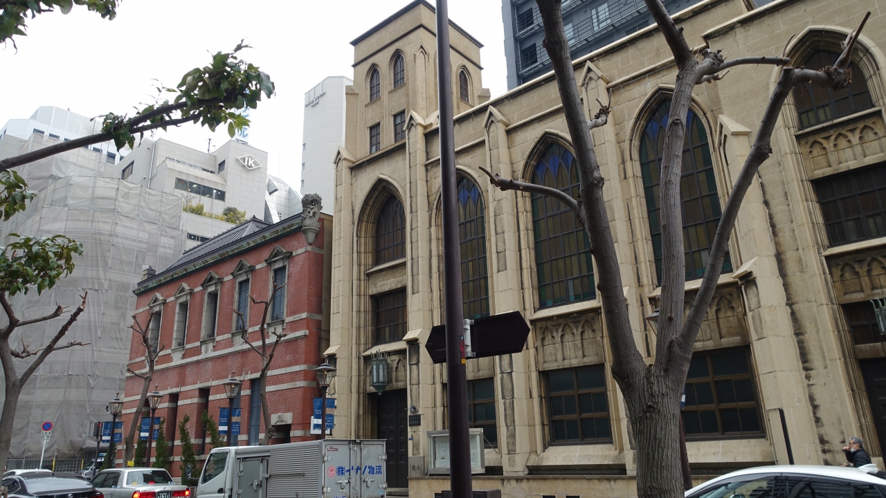 日本基督教団浪花教会は教会建築を得意としたヴォーリスが設計し、昭和5年(1930)建築された。ゴシック風の高さを強調した縦長の窓が並び、くすんだ外壁がいい味を出している。西洋の教会は何時でも開いているが、ここは施錠されて内部を見ることが出来なかった。隣接する赤煉瓦の旧大阪教育生命保険ビル(現在は空き家?)を一緒に見るとヨーロッパの街角のようである。