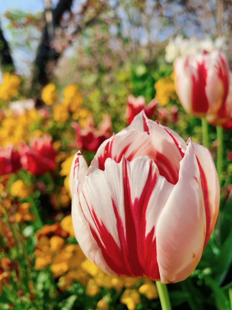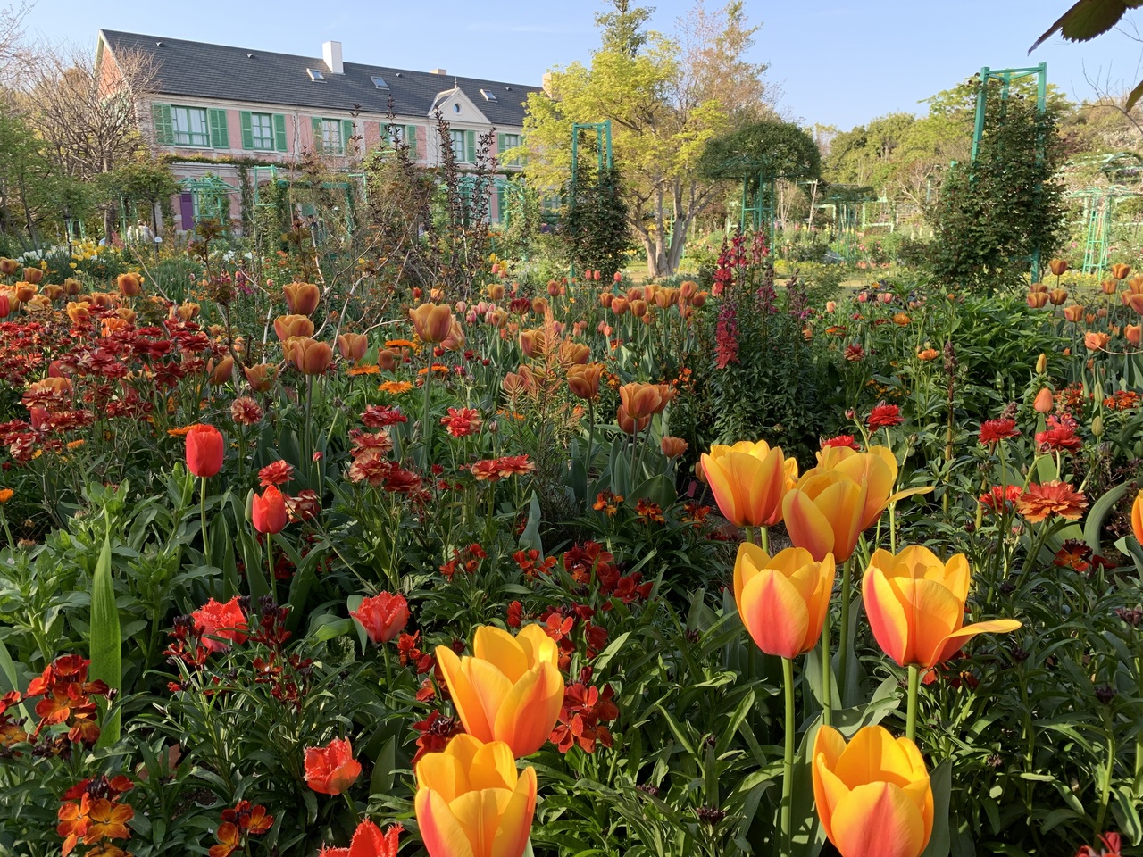 里のエリアの端っこに、花の美術館というエリアがあります。 こちらの庭園の花の様子をSNSで見ていて、浜名湖ガーデンパークを訪れるなら絶対に行きたいと思っていたのです。 このエリアは、印象派のクロード・モネがフランスのジヴェルニーに造った庭を、モネ生前当時の姿を模したものとして、2004年に開催された浜名湖花博の際に造られたそうです。 季節ごとに色々なお花を楽しめます。 チューリップがちょうど見頃を迎え、それ以外の花も青空をバックに楽しめて、最後に訪れて良かった!と思います。