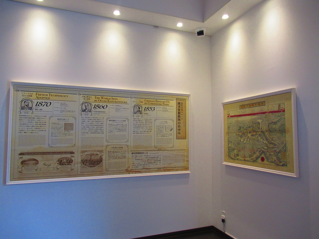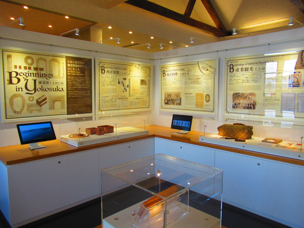 1869年にフランスから来日した、横須賀製鉄所副首長のジュール・セザール・クロード・ティボディエの官舎です。1869(明治2)年頃に建築され、2003(平成15)年に解体された建物を再現してオープンしました。再現と言っても木骨煉瓦壁や小屋組みなど一部を移設して展示しているだけで、建物はとても新しくてキレイでした。横須賀製鉄所の歴史などを展示していて、横須賀の観光パンフレットも置いてありました。