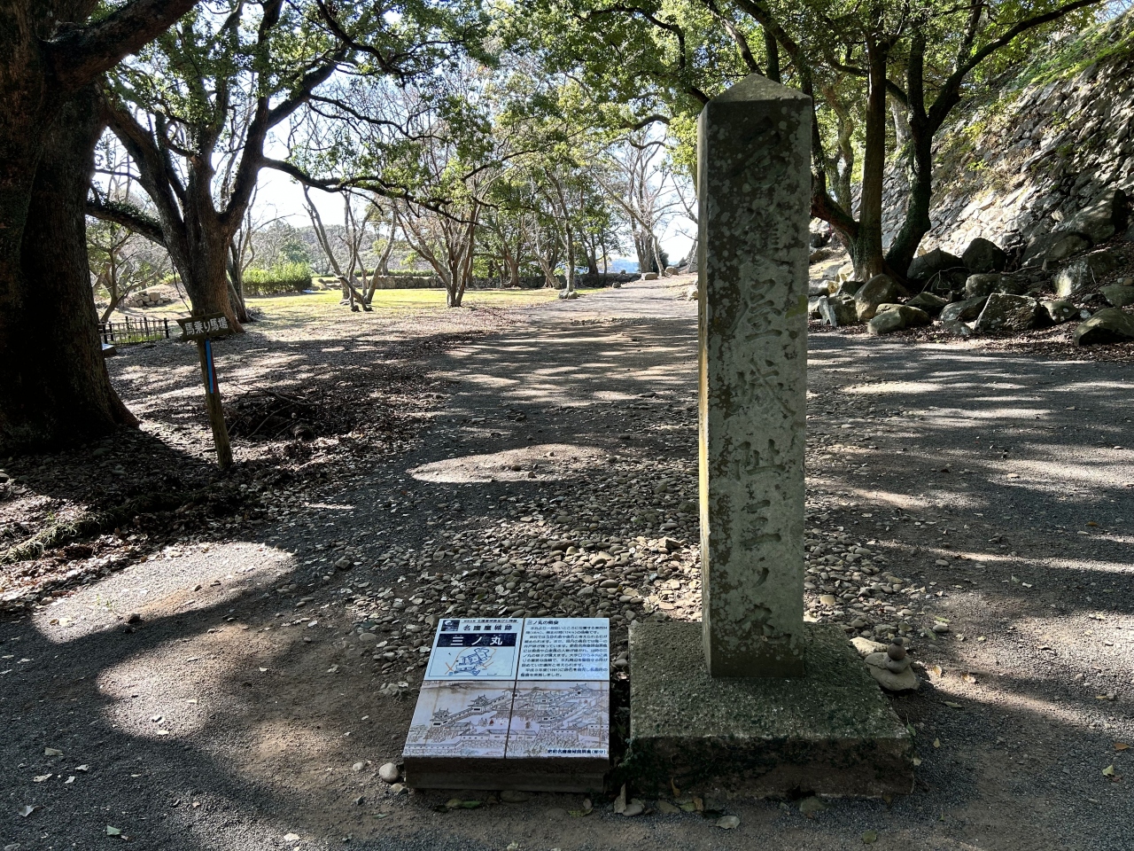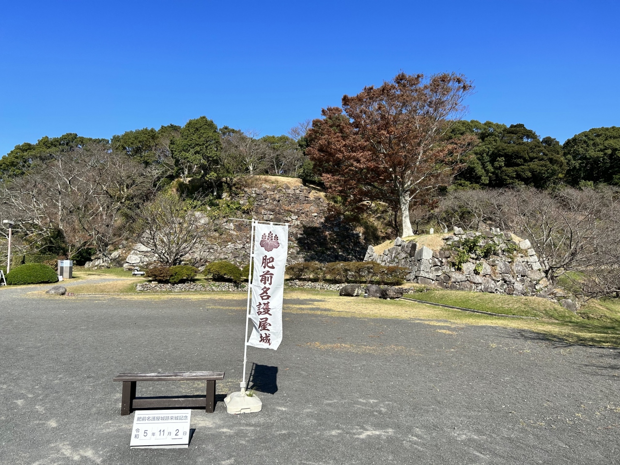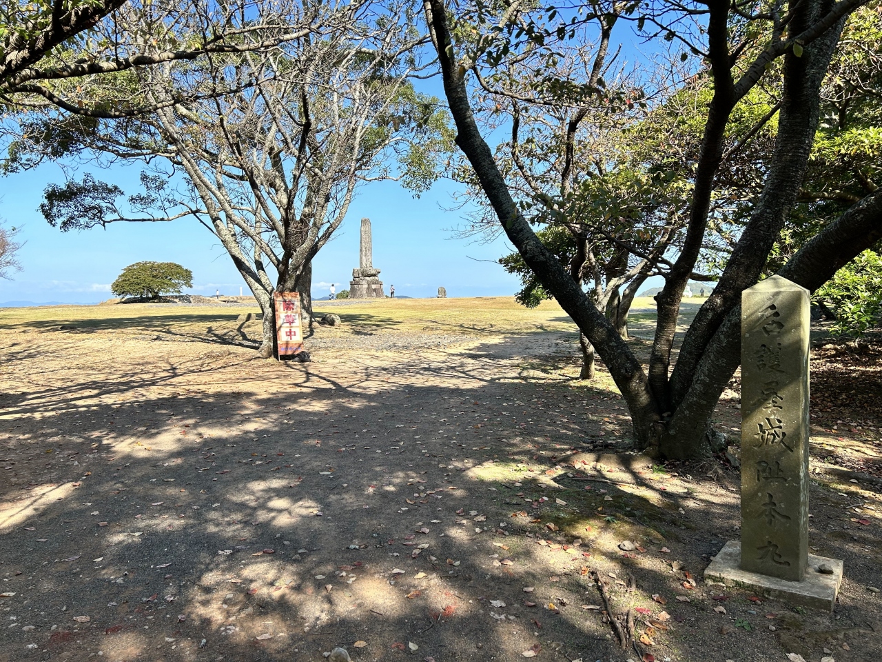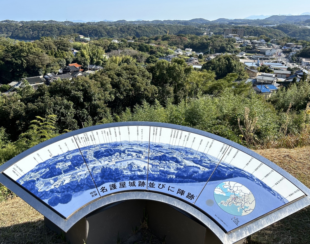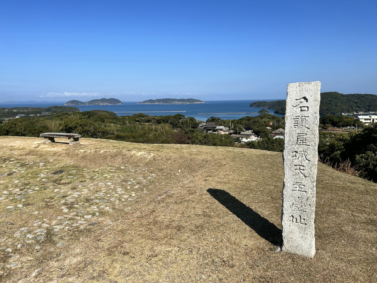 天正19年(1591年)に築城が始まり、諸大名の分担によって数ヶ月で完成したという大陸侵攻の前線基地。豊臣秀吉自身も1年あまり在陣したらしい。徳川家康、伊達政宗、真田昌幸/信幸、前田利家、黒田長政…といった諸大名の陣屋が城下に布陣されていました。本丸御殿跡には「名護屋城址」の碑。天守台から北側には、加部島・加唐島・松島を望みます。この先に隠岐島・対馬、そしてさらにその先には朝鮮半島…秀吉はこの場所から大陸を望み、侵攻の野望に燃えていたのでしょう。