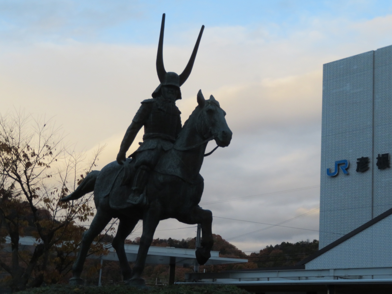 JR彦根駅を出るとすぐに目に入ってくるのがこの銅像。彦根藩の初代藩主であった井伊直政の像です。鎧兜を身に着けて馬に乗っている姿は勇ましく戦国武将だったことがわかります。とくに兜のから伸びている角のようなものかとても長くて特徴的でかっこよいく見えました。