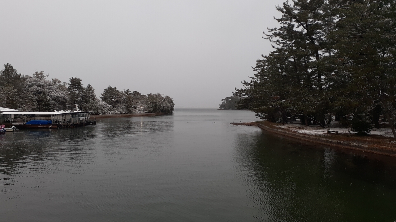 天橋立の玄関口ともいえる橋の為、基本的には人の姿が多く賑わっているのですが、2022年12月18日の16時30分頃に訪れたところ、天気が雪ということもあり、人の姿はほぼなく、静かな小天橋を体験することが出来ました。