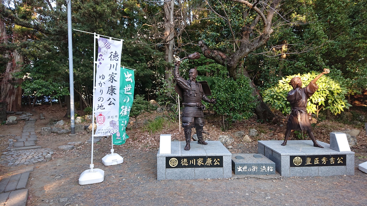 曳馬城(浜松城築城前の時代の城)跡に立地している、東照宮です。1月中旬の平日の午後4時頃に訪問しました。今回の訪問で、特に印象に残ったのは、「徳川家康と豊臣秀吉の像」。遠江を領国とした、徳川家康はもちろんゆかりがありますが、豊臣秀吉は、遠江の武士に仕えていた時期があるとのこと。確かに像があってもおかしくはないかな、と感じました。