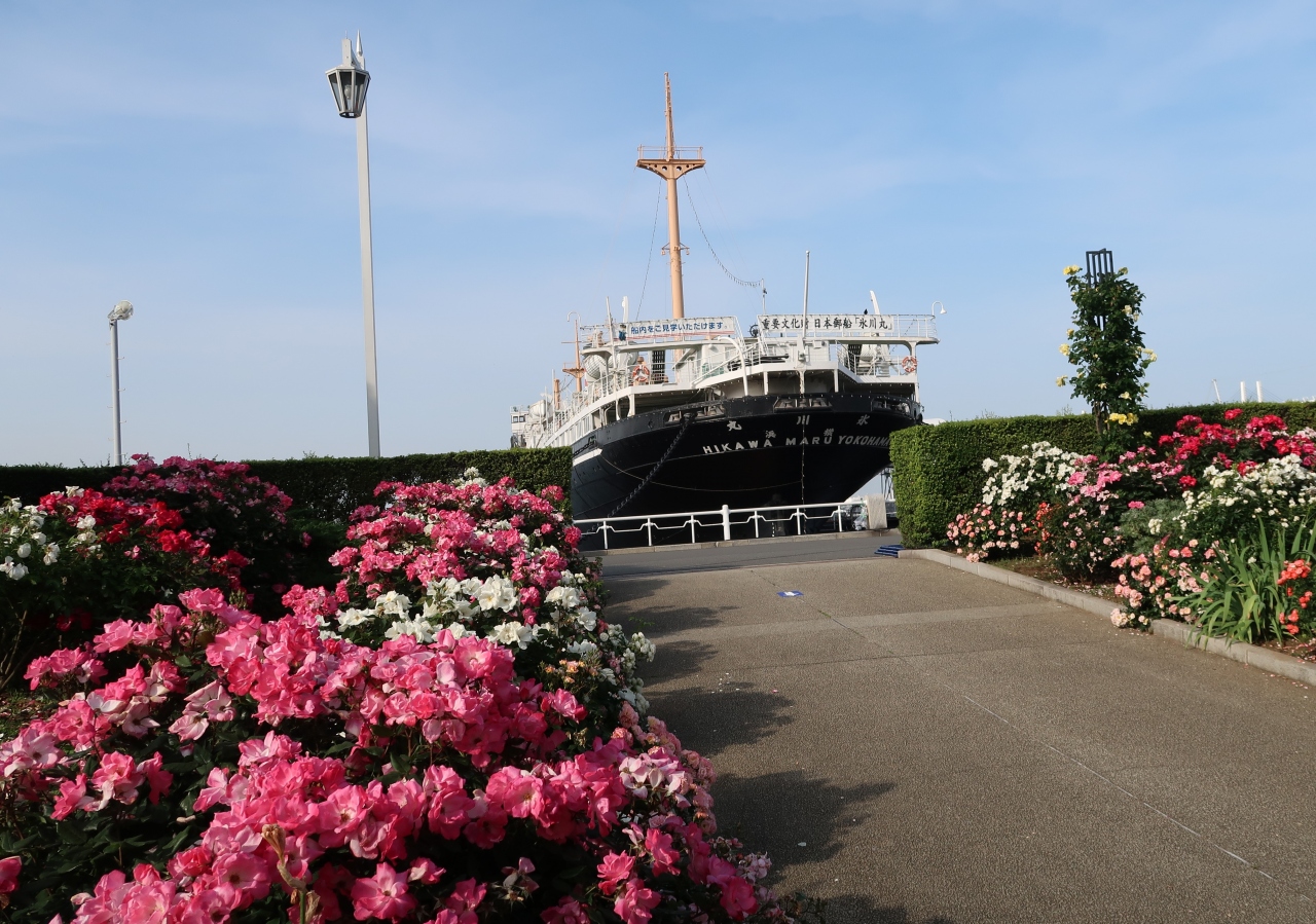 山下公園の未来のバラ園の正面に停泊している横浜の象徴の貨客船です。コロナ禍で海外に行けない日々が続くので、戦前の豪華客船の旅を追体験するために、初めて乗船してみました。氷川丸の名は、埼玉県の氷川神社から名づけられたもので、操舵室には神棚があり、食堂から社交室へ上がるアールデコ様式の美しい階段の手すりは、氷川神社の神紋で装飾されていました。氷川神社の神様が守ってくれたおかげで、戦前に造られた船の中で、沈むこともなく現代に残された唯一の貨客船で、重要文化財になっています。