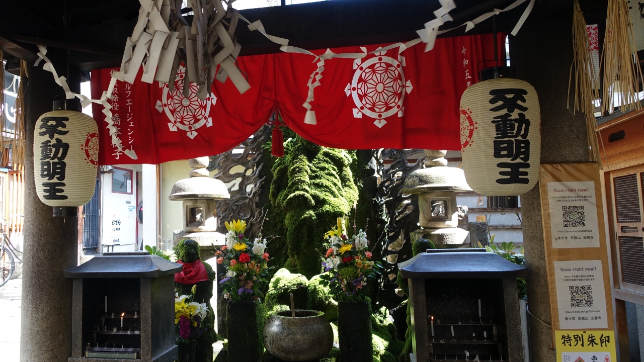 法善寺横丁の入口近くに天龍山 法善寺という浄土宗の寺がある。法善寺横丁の名前の基になった小さなお寺だが、ミナミの観光名所になっている。お目当ては境内にある水掛不動尊で、参拝に来たカップルは必ずお不動さんに水を掛けて将来を祈る。長年水を掛けられ続けたお不動さんは、緑の苔で覆われ原型もわからないほど。