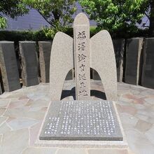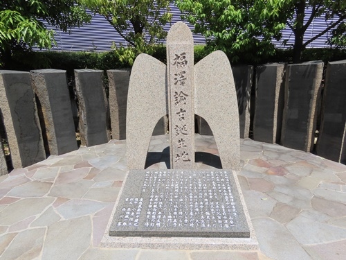 「ほたるまち」の一角にあります。かつてこの場所は豊前中津藩の蔵屋敷の長屋跡だったそうで、かの福沢諭吉はここで生まれたのだそうです。とても立派な碑で慶應義塾の関係者が1954年(昭和29年)に建立しています。