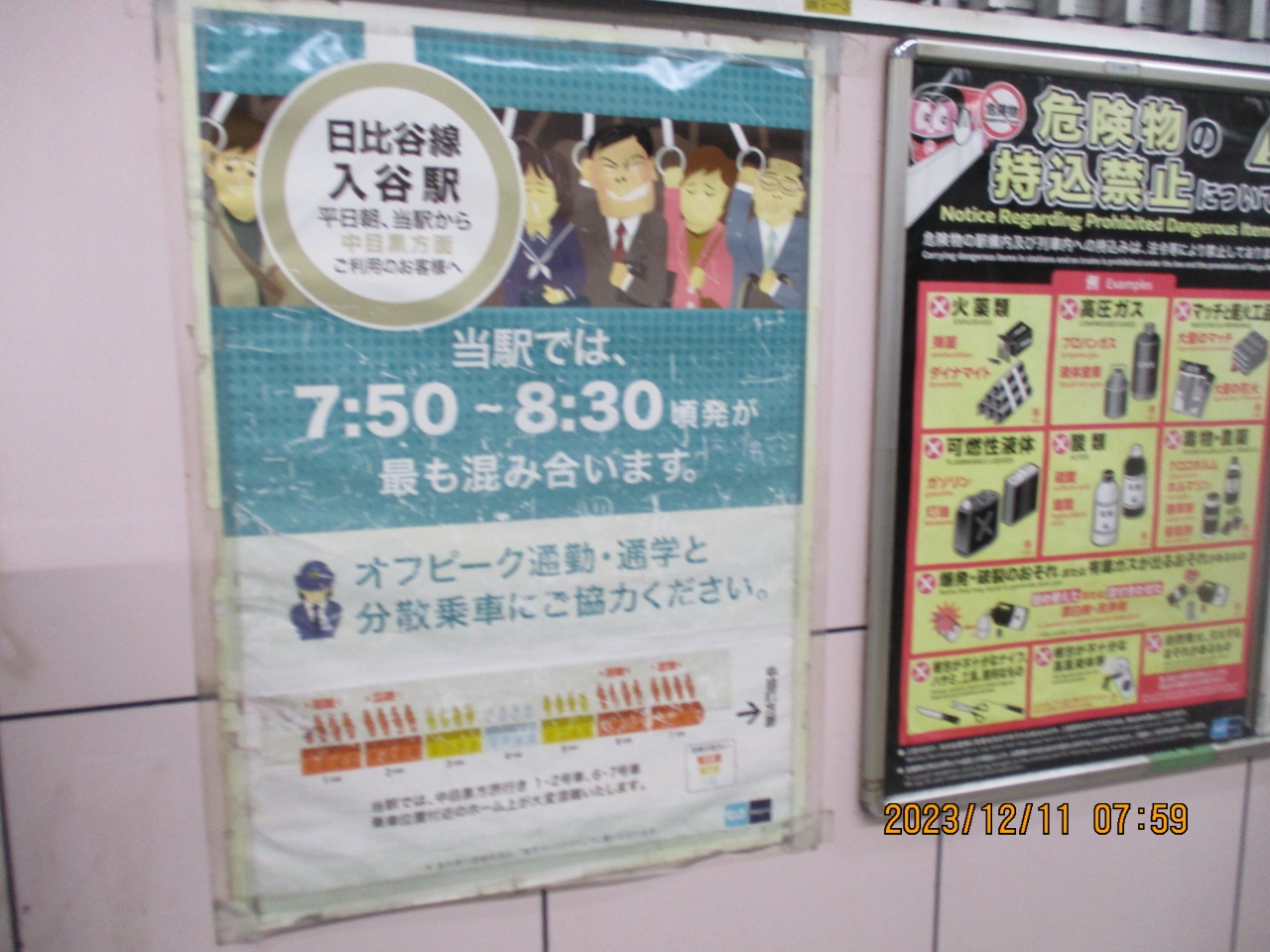 宿泊したホテルが日比谷線入谷駅まえです。駅のホームにはポスターに混雑時間の表示が有ります。0750-0830頃。