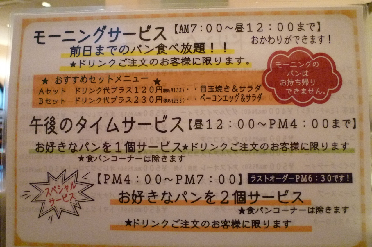 前日のパン食べ放題のモーニングをこちらのお店で。かなり混むというので、午前7時開店に併せて初入店。開店したばかりなので、パン売り場のコーナーにはまだ焼きたてのパンが1/3ほど。それでもかなりの種類がある。BGMはピアノ・ヴァイオリンなどの楽器演奏が主体。調度品はやや古さはあるものの、静かで落ち着きのある雰囲気。週刊誌・コミック・新聞なども置かれてあるので退屈はしない。さて、肝心のモーニングはと言うと。ホットコーヒーにモーニングとオーダーすると、お皿に温まったパンが三種登場。明太入りパンやコロッケ入りパン、シュガークリーム入りパン。前日のパンとは思えないほど美味しい。一皿目は軽く平らげて、二皿目、一時間空けて三皿目もおかわり。皿ごとに異なるパンが出てくる。しかも温まった状態で。コルネ、ポテトサラダ入りパン、ウインナー入りパン、ピザなど、パンのオンパレードだ。お客さんを飽きさせないように工夫されているのが素晴らしい。三皿目も平らげてギブアップ。こんなにパンを食べ尽くして、たったの税込み¥440とは!コスパ驚高のモーニングでした。