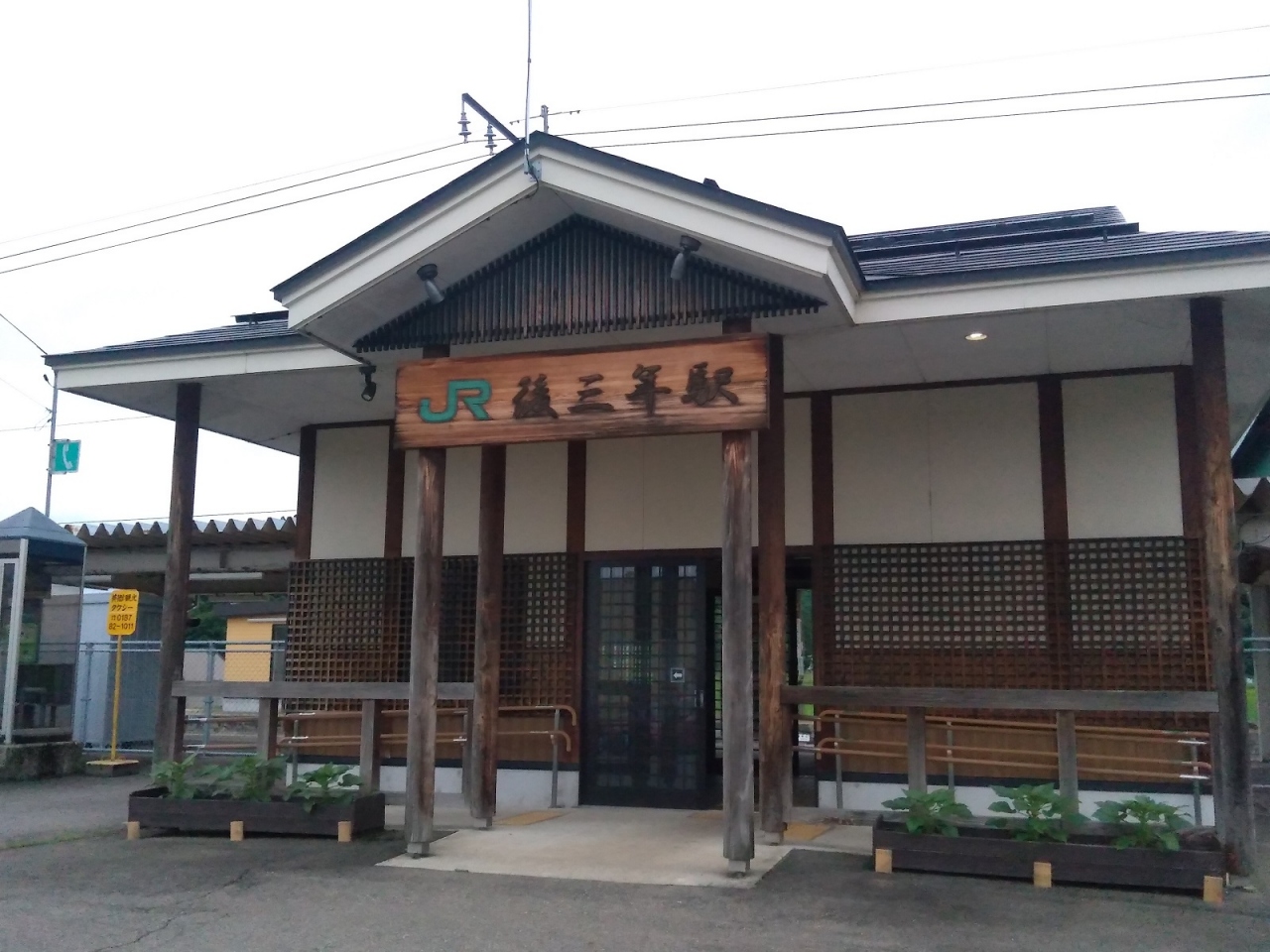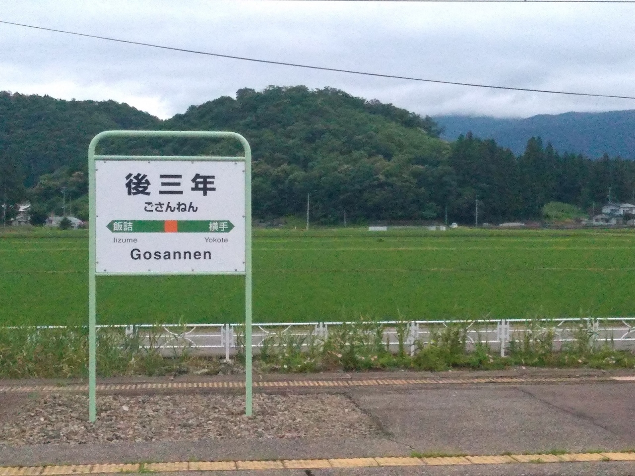 後三年の役の合戦場があったエリアにある駅。無人駅ながら待合室を兼ねた駅舎があり、2012年完成とあってきれいだ。その待合室からアクセスできるトイレもしっかりと管理されていてきれいに利用できる。ちなみに歴史に疎い私は初見で「あと3年」と駅名を読んでしまった。