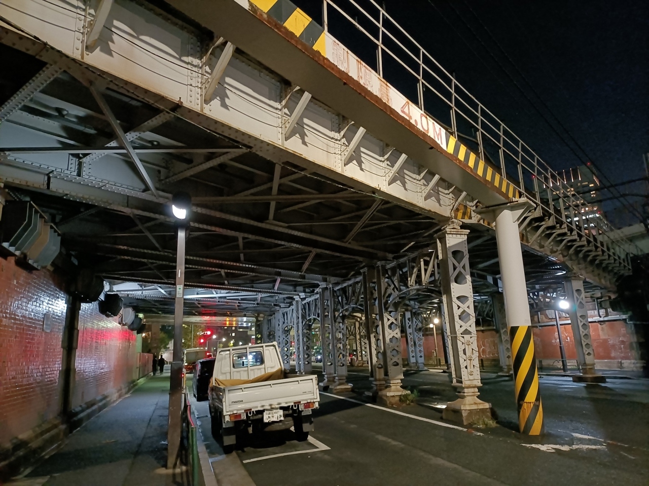 日本橋から神田方面に向かって散策していた際、【常盤小学校】からほど近いこちらの高架橋をくぐりました。レンガ造りの壁の上に鉄骨むき出しの架道橋がどっかと架けられていました。トラス構造の高架とアーチ構造を組み合わせたそれをそれを支える柱が不思議な造形となっていました。また、橋の下には駐車用のスペースもあって、作業車が駐車できるよう配慮されているようでした。