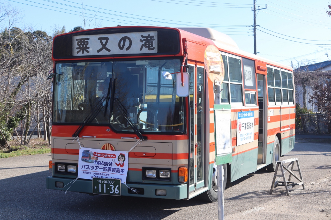 小湊鐡道の列車で養老渓谷駅に着くと粟又の滝行のバスが接続しています。距離にして6キロちょっとあり、歩くにはちょっとあります。バスは養老渓谷駅~粟又の滝のほか、いすみ鉄道と接続する上総中野駅にも通じています。