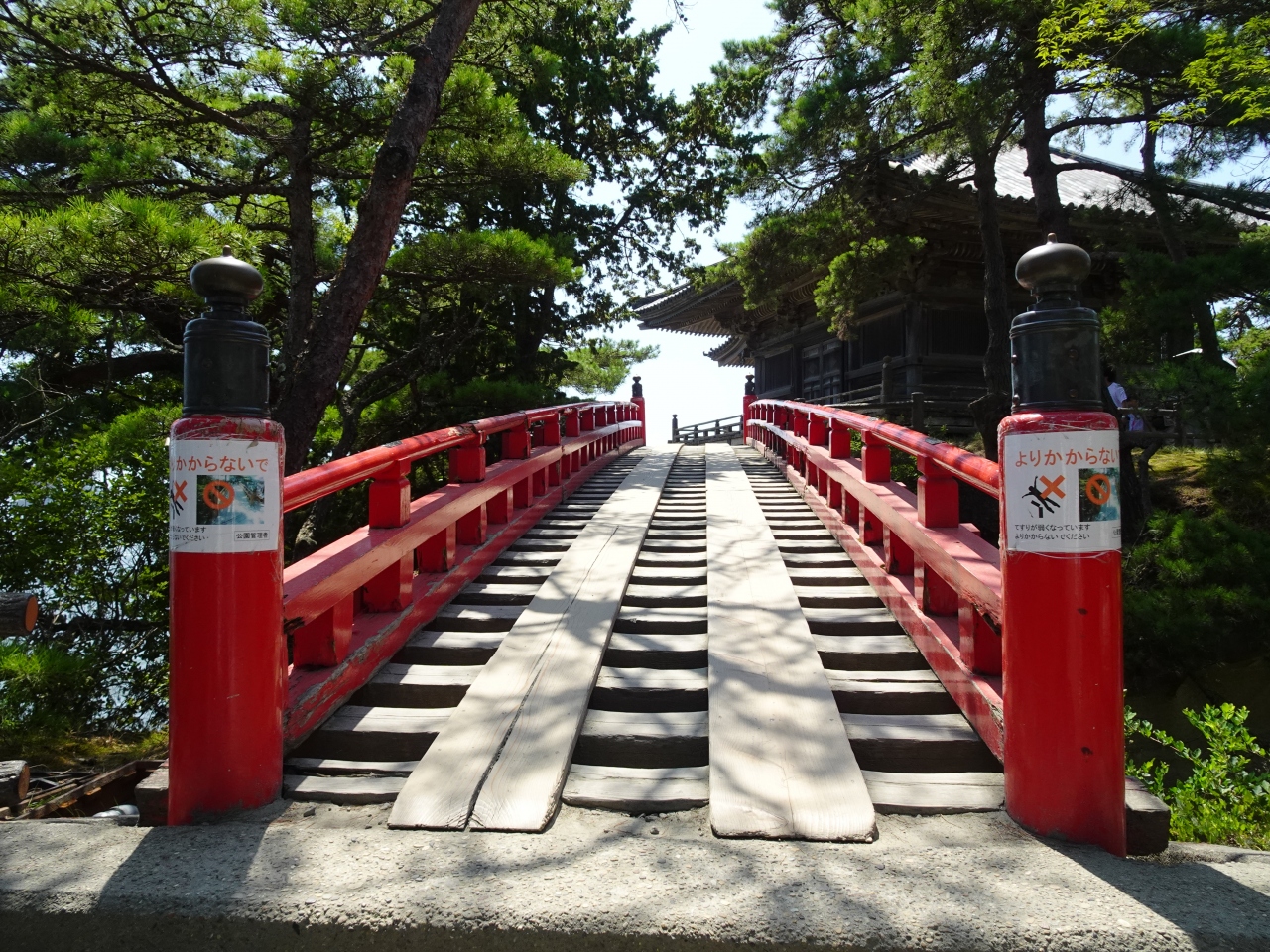松島観光スポットの一つです。朱色の透橋を渡ると五大堂が建っています。小さな小島に建っているのですね。透橋は、橋桁の間が空いており、上から下の波が透かして見えるので透橋と言われています。また、透橋から見える五大堂の眺めが素敵です。五大堂は、807年、坂上田村麻呂が東征のとき、毘沙門堂を建立しました。後に慈覚大師円仁が五大明王像を安置したことから、五大堂と呼ばれるようになったそうです。現在の建物は、1604年に伊達政宗公が再建したものです。東北地方最古の桃山建築です。お堂の四面には、十二支の彫刻が施されていますよ。素朴な建物にも見えますが、じっくり見ていると味が出てきます。とても上品な建物に見えてきます♪。