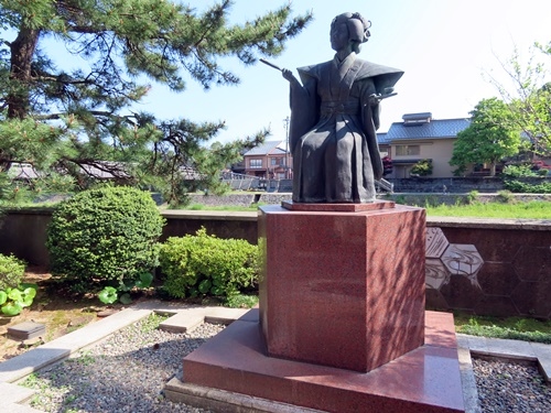 泉鏡花の代表作。じゃなくて泉鏡花の小説「義血侠血」を原作とした新派劇、でした。水芸人「瀧の白糸」が主人公で映画になったのが1915年(大正4年)ですから、サイレント映画の時代、つまり弁士が場を盛り上げてた時代の作品。浅野川左岸、梅ノ橋より少しだけ上流に碑と像があります。