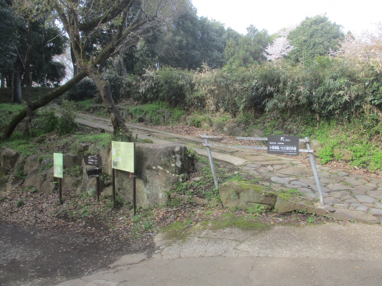 小峯御鐘ノ台大堀切は鬱蒼とした木々が高い両脇の土塁上に繁り、堀底は左右にうねりますので、奥がうねった土塁の法面で見えない状態でした。解説板によると、三の丸を形成する新堀の一部で、幅20から30m、深さ12m、法面傾斜50度くらいということでした。