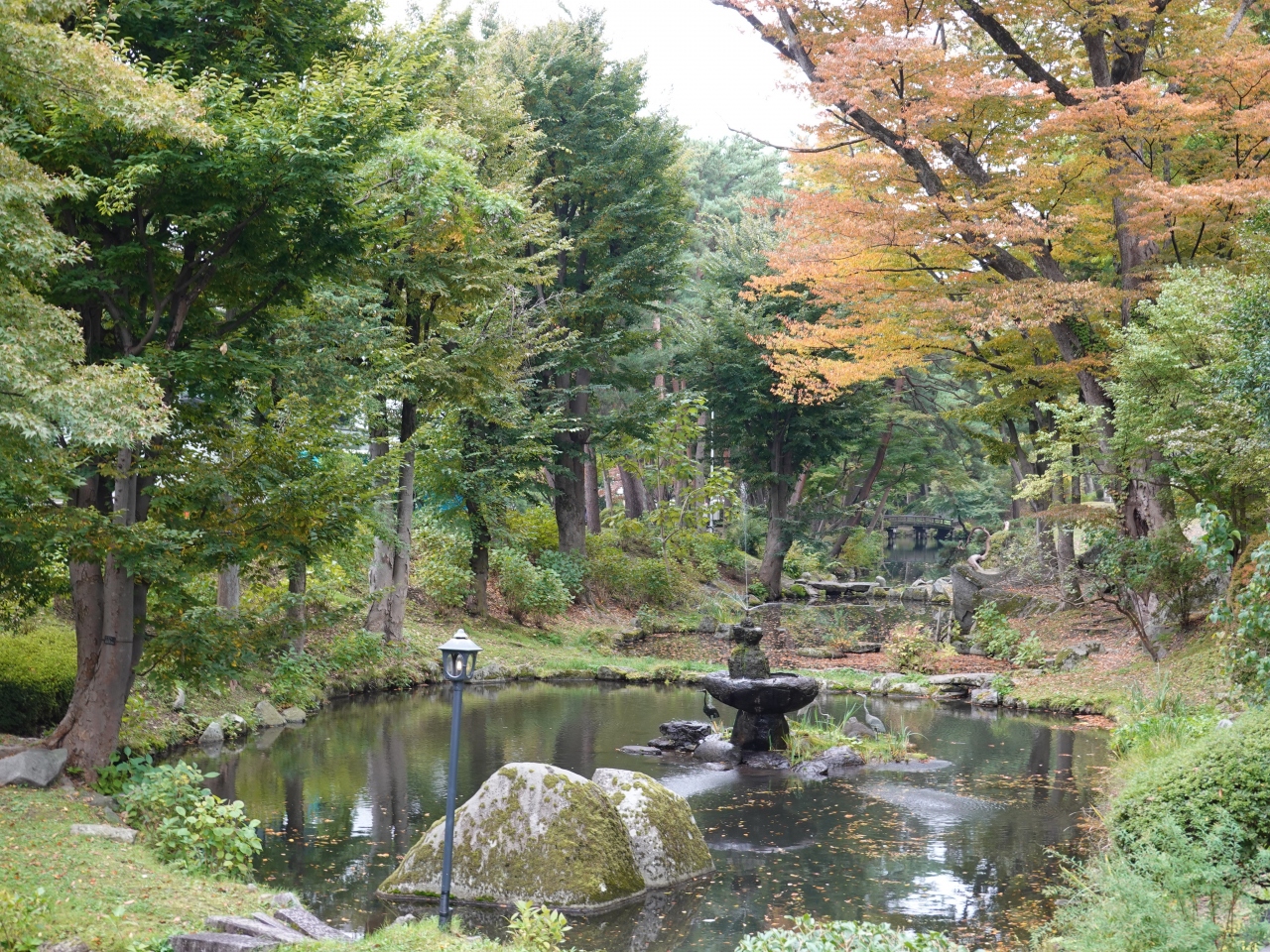 岩手県庁と盛岡城跡公園の間に挟まれた場所が「内丸緑地」です。10月下旬に訪れたところ、既に紅葉が始まっており、色彩豊かな光景が楽しめました。あいにく青空はありませんでしたが、のんびりと散策するのが心地よかったです。