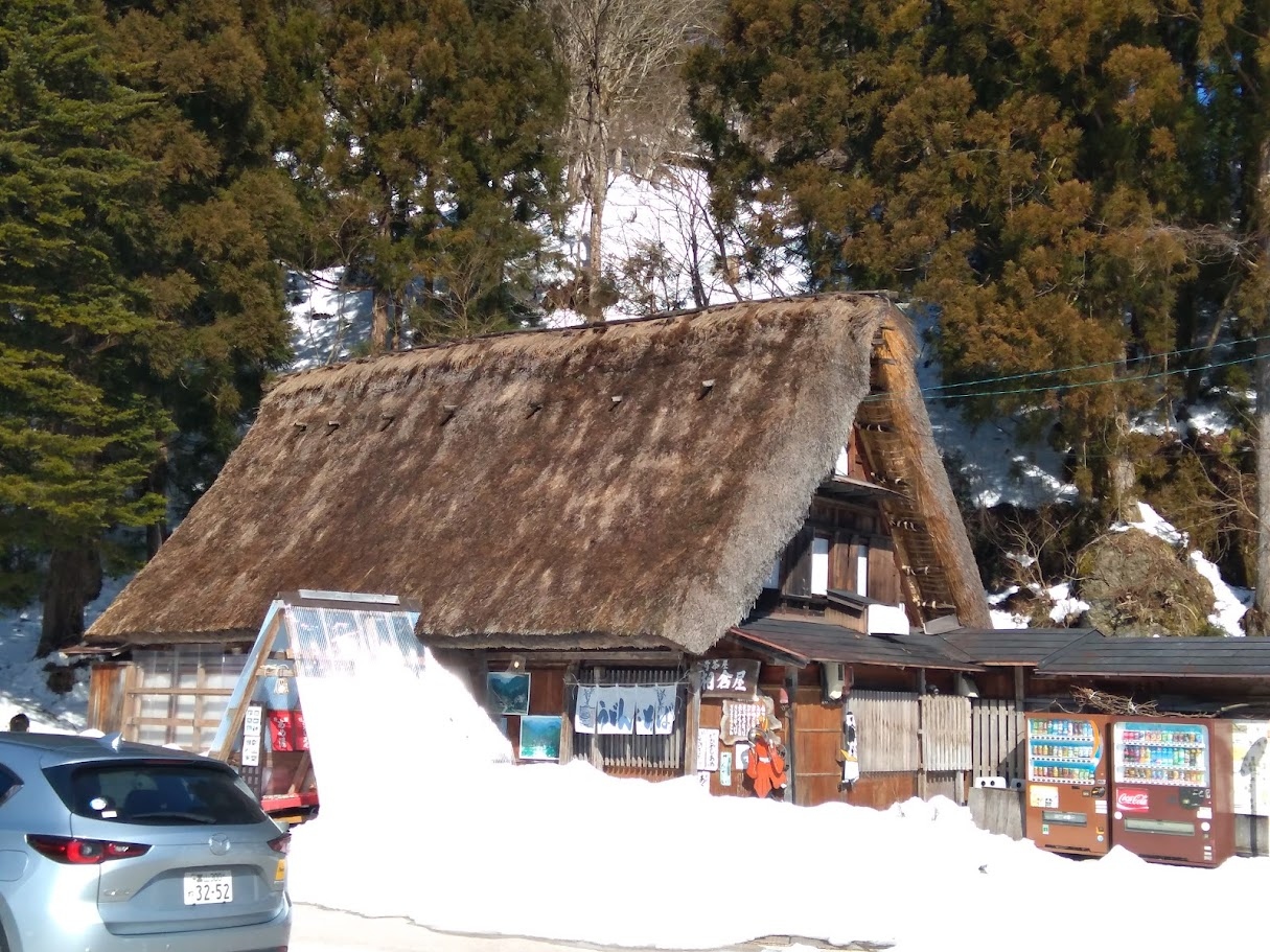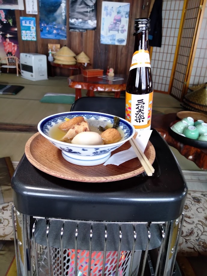 駐車場の一角にある茅葺葺きのお店です。おでんと蕎麦とお酒を頂きました。他にちょっとしたお土産なんかも置いてあります。畳敷きの部屋に上がってストーブのそばでゆっくりとできました。愛想のいいお母さんにも地域のお話など聞かせてもらいました。