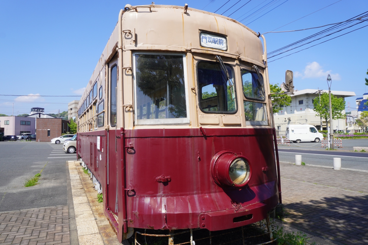 ワンマン(ボギー)車100形電車は、昭和60年まで北九州市街で運行されていた路面電車。1935年から1936年にかけて17両が製造されて、その一台が公園の隅に保存展示されていました。茶系のツートンカラーは落ち着いた感じ。行き先は門司駅前と表示されています。