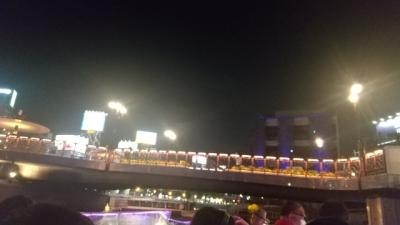 クルージングが30分1000円でできるとのことで、乗ってみました。川から中州沿いや橋のイルミメーションが見えて、川からの風も気持ちよく、のんびりとクルージングを楽しめました。博多で有名な中州は那珂川と博多川の間にあるんだそうです。