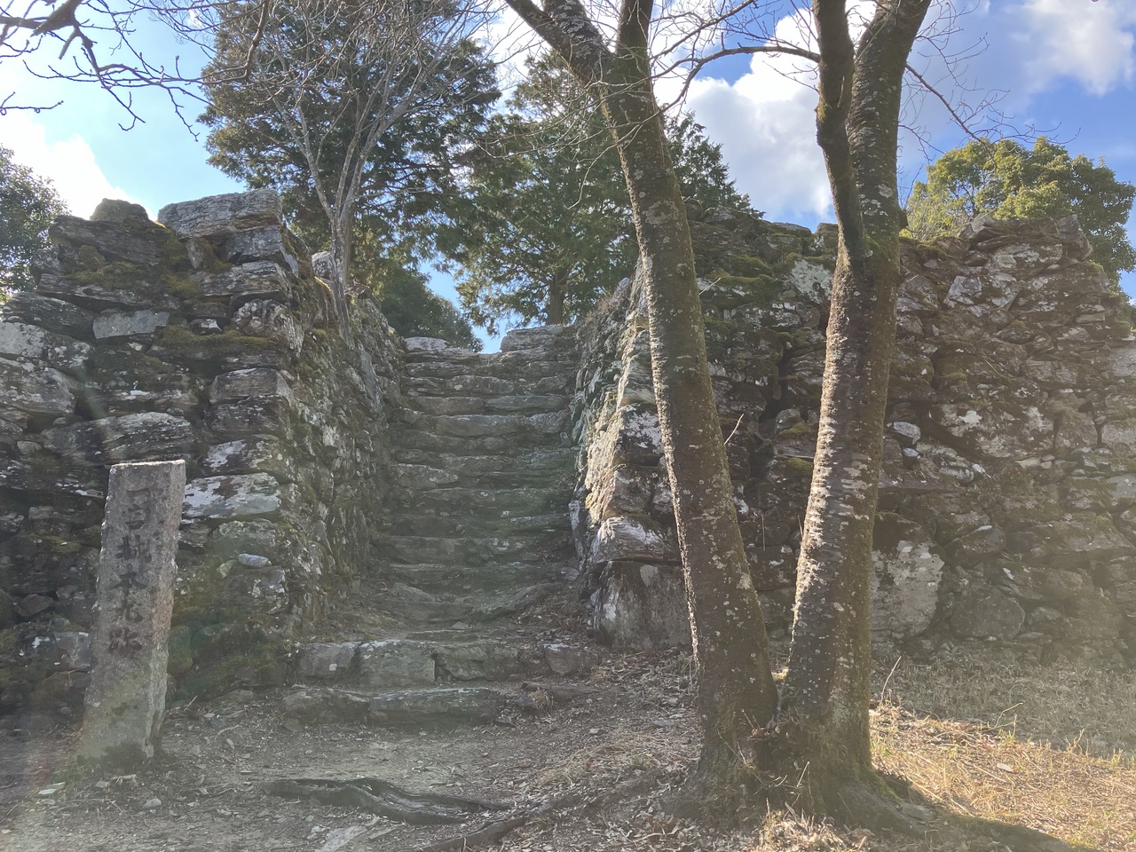 ここはほぼ石段がきちんと整備されていて非常に歩きやすいです。登山道から天守までは早めにあるいても50分位。650メートルと標高があるので、実際より歩いている感じがします。突然現れる天守の石垣は圧巻です。