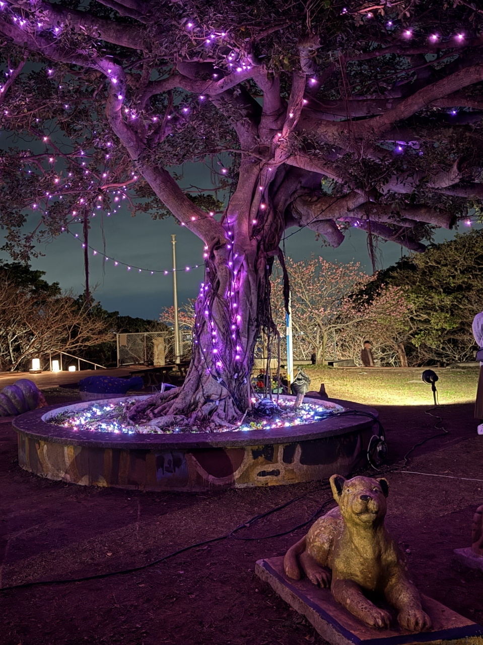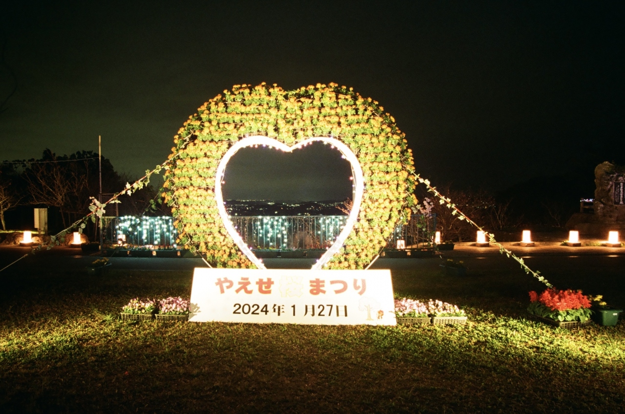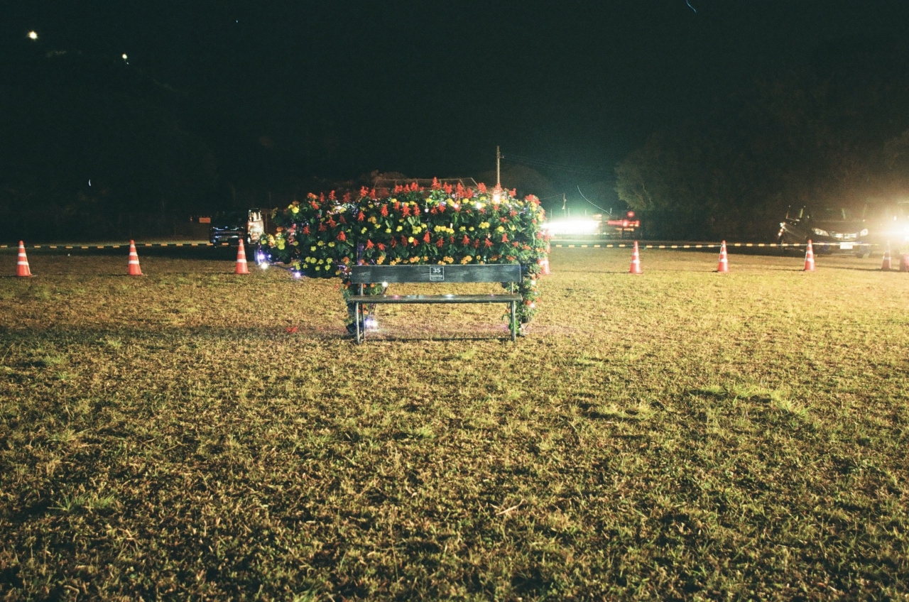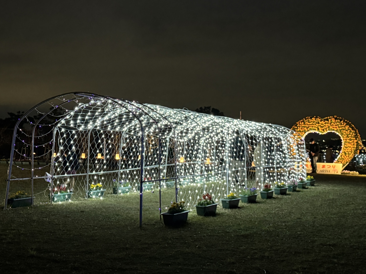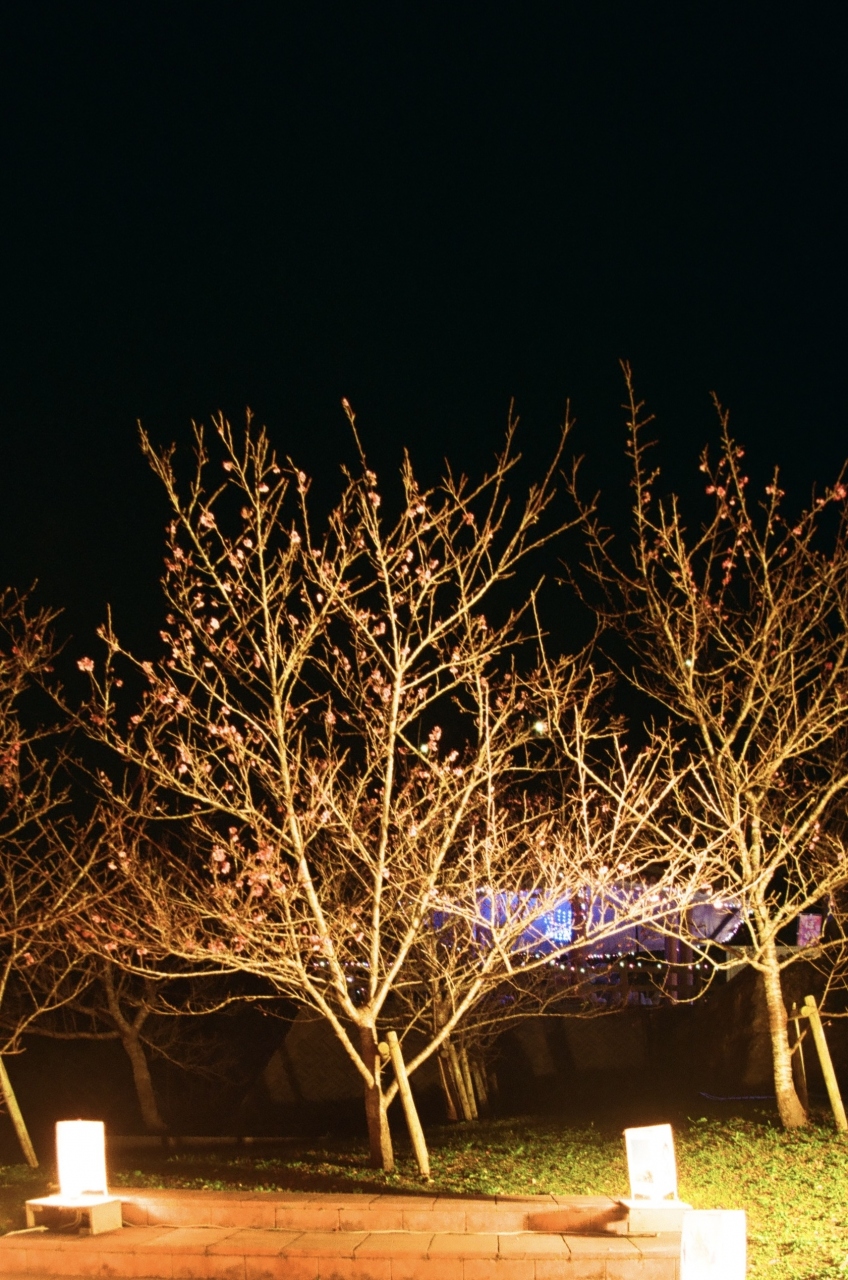 グラウンド半分を利用したイルミネーションの他、中腹の駐車場に繋がる階段両脇にある“カンヒザクラ”がライトアップされ、花見とイルミネーションを体験できるイベントとなっている。