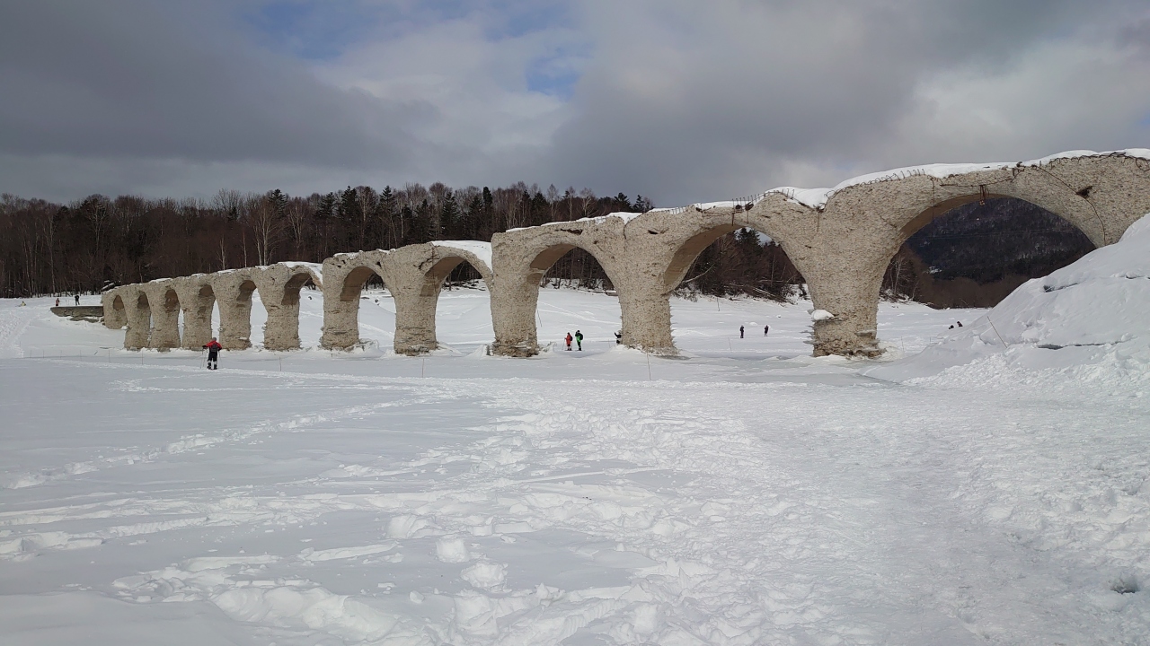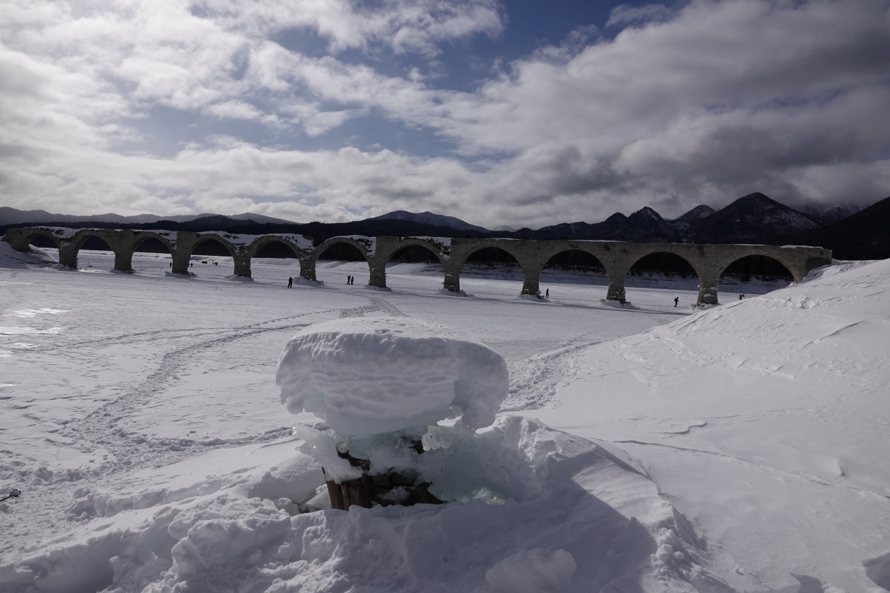 今年の冬は湖面の下がりが早く、糠平湖上を歩いてタウシュベツまで行ける期間は1月のみととっても短く、行った時にはガス穴も多く危険に注意しながらの散策でした