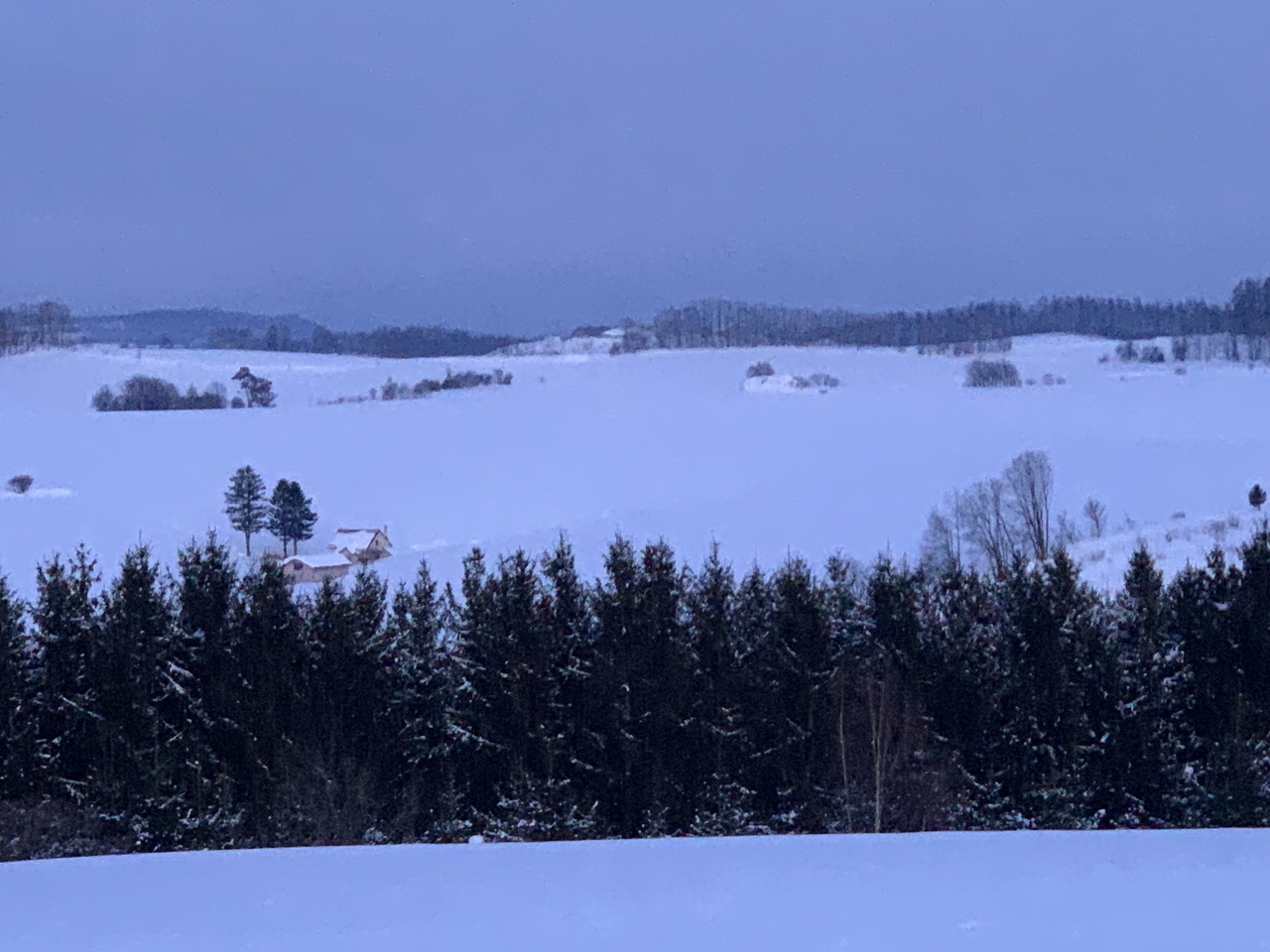 東は十勝岳連峰からの赤い屋根の小屋が、