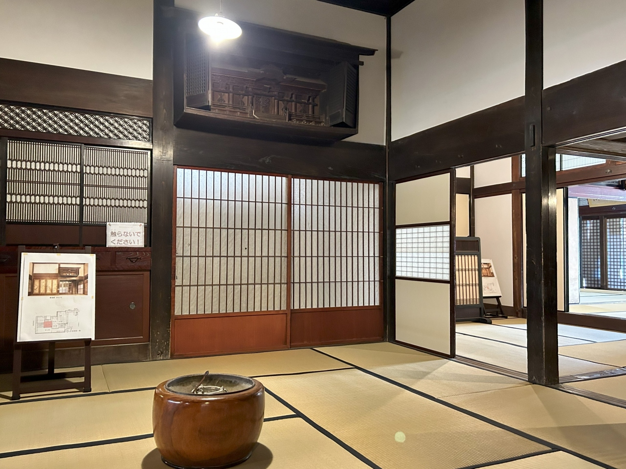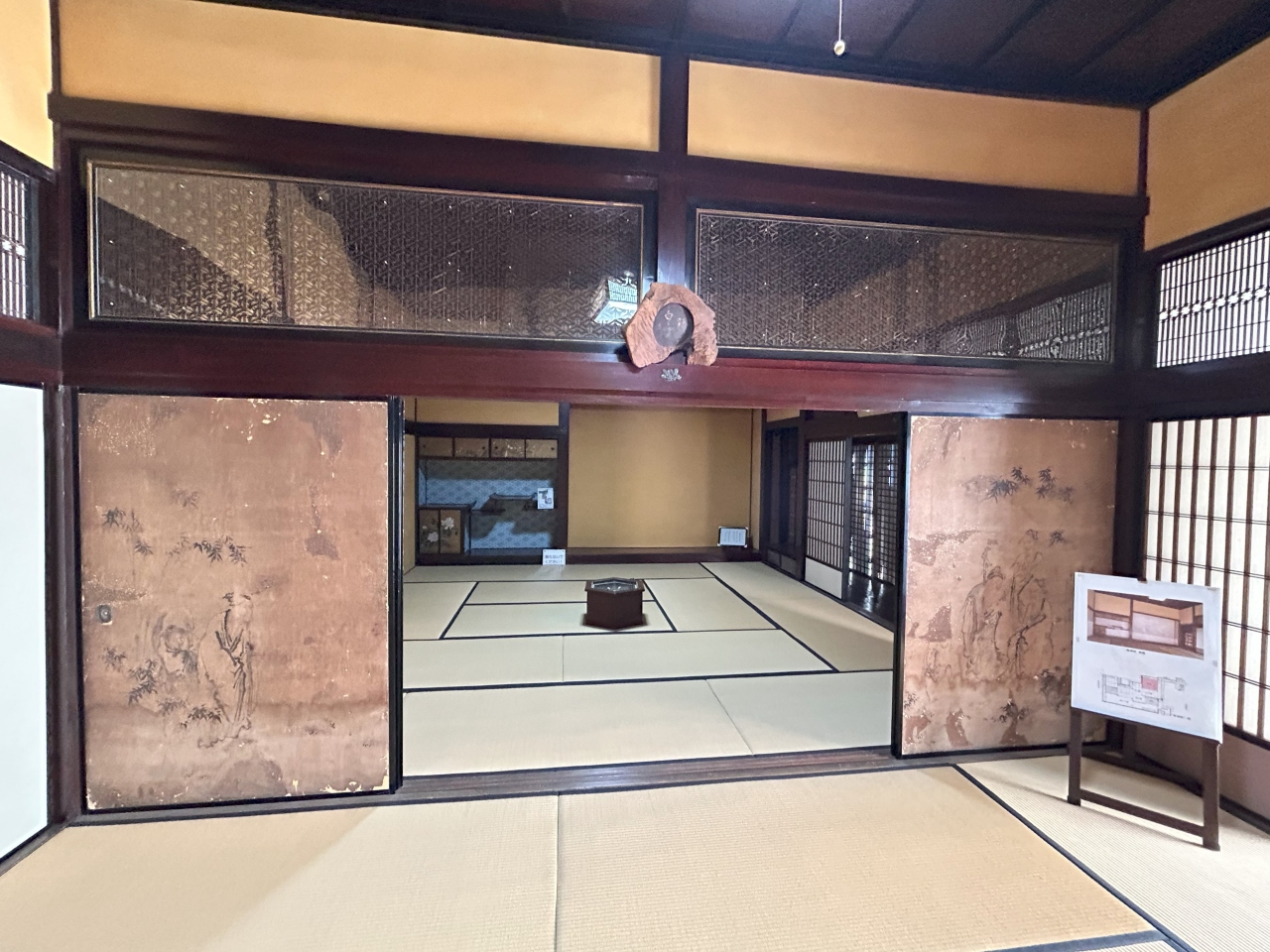 白漆喰の大型町家「居蔵家(いぐらや)」が修復され、綺麗な街並みが再現されている塩田津の街並みを代表する、国指定重要文化財に指定された江戸時代の豪商の邸宅です。廻船問屋で財を成した豪商・西岡家が安政2年(1855年)に建てた住宅だそうで、商家だっただけに大きな間口を持つ立派な邸宅です。明治以降は陶石販売、昭和50年(1975年)までは金物店、 昭和52年からは空家でしたが、平成12年から嬉野市が管理し建築当初の姿に半解体修復されたとのこと。欄間や襖絵など商家で栄えた名残りを感じることができました。