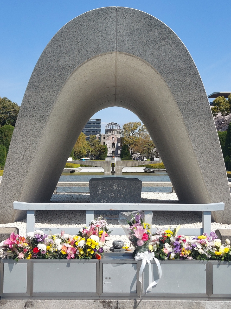 慰霊碑にはたくさんのお花が、原爆の子の像にはたくさんの千羽鶴が手向けられていました。