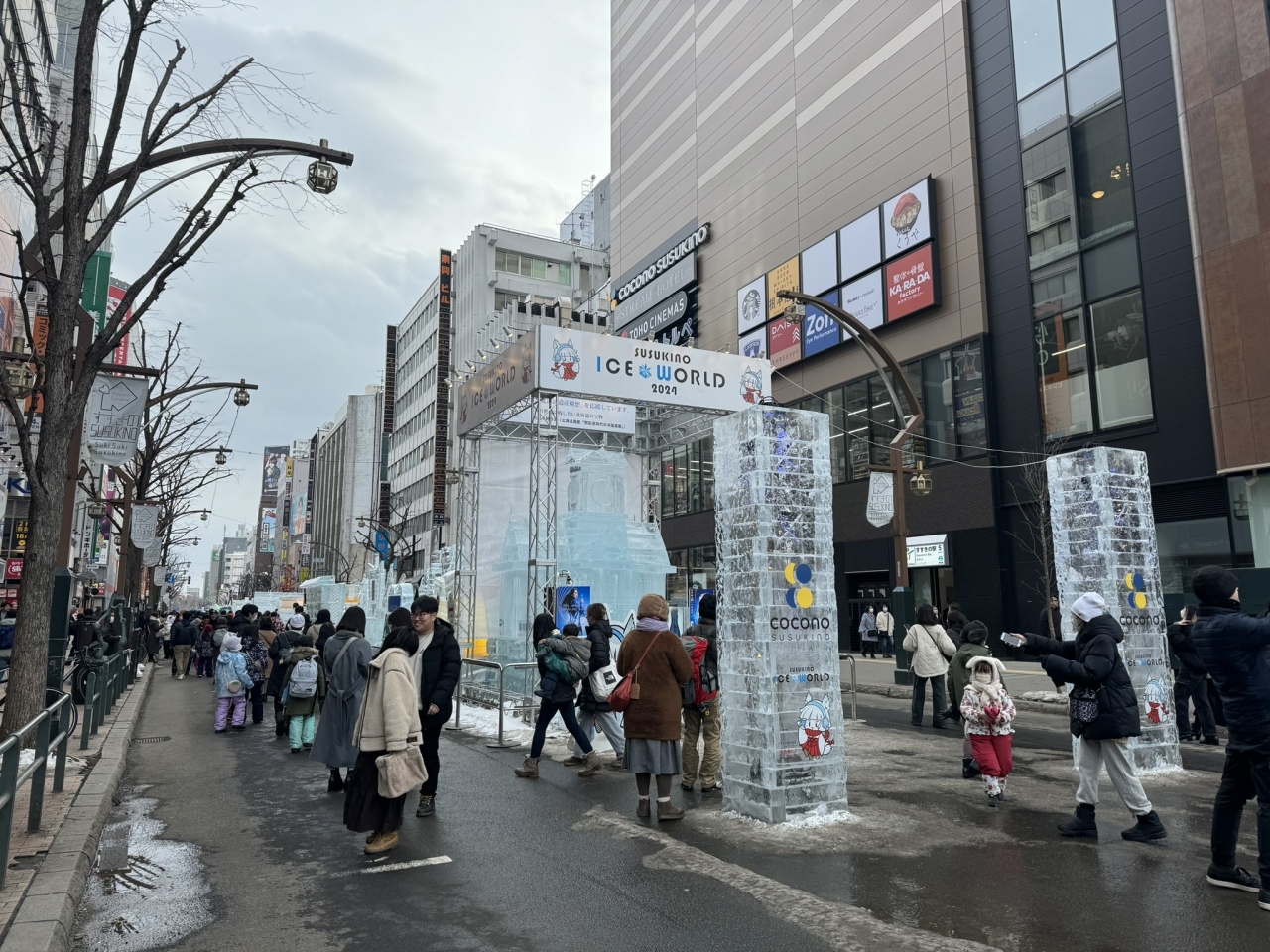 さっぽろ雪祭りでは、大通公園会場が雪の彫刻であるのに対して、すすきの会場には氷の彫刻が展示されます。約200mに渡って、車道の中央が会場になって氷の彫刻が並びます。日中は道路が通行止めになるので、車道の上を歩きながら氷の展示を近くで楽しめますが、決められた時間帯以外は通行止めとならないので、展示のすぐ横を車が走り、少し離れた歩道から展示を見る形になります。