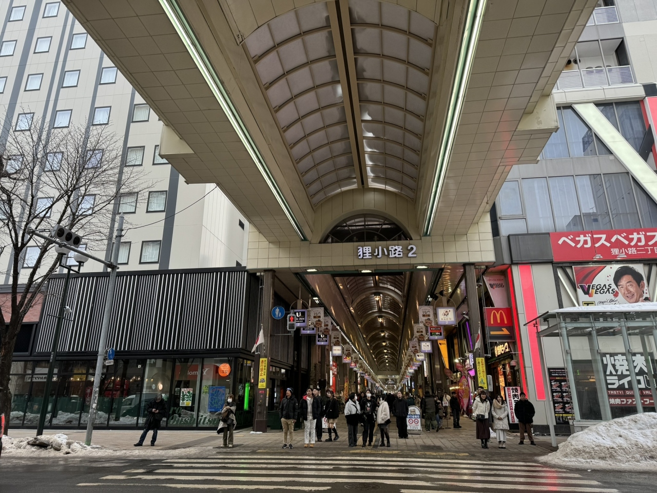 大通公園とすすきのの中間あたりにあるアーケード商店街で、東西に900mの長さがあります。通りに比べてお店が密に集まっており、カフェやお食事処、ショップなどが並んでいます。