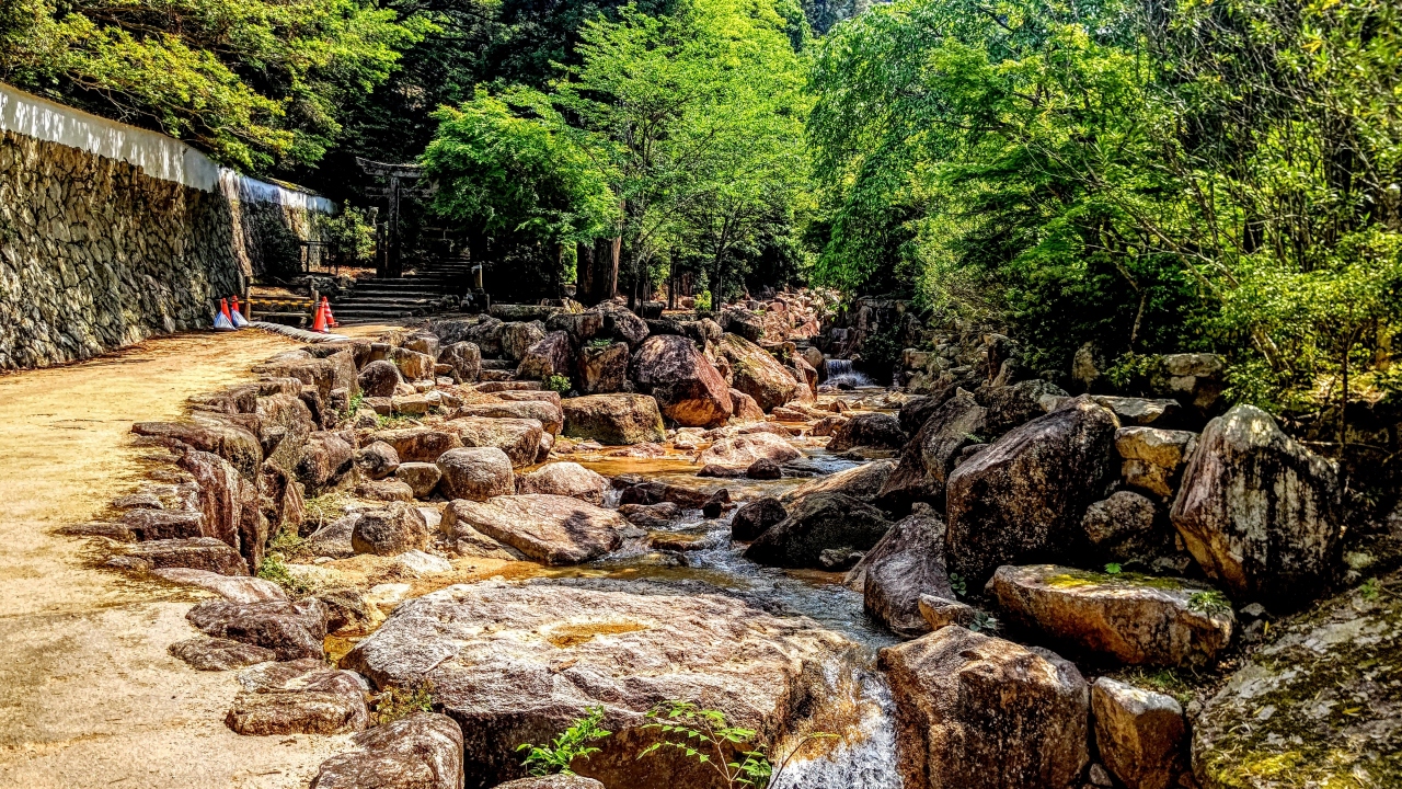 滝橋は白糸川にかかる。白糸川は宮島に流れる小さな河川。その名の通り晴れた日であれば白糸のように細々と川が流れている。護岸工事が成されており、河川はしっかりと整備されている。一度大雨が降ると白糸川は様変わりし、土石流を、押し流し危険な河川になるので注意が必要だ。
