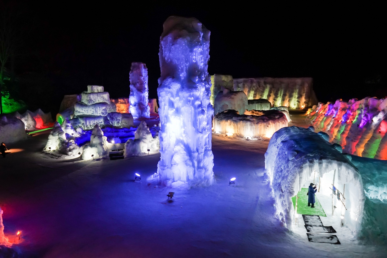 昼は支笏湖ブルーと呼ばれる澄んだ青に輝く氷像が、そして夜はカラフルなライトに照らされた氷像が、来場者を幻想的な世界に誘います。
