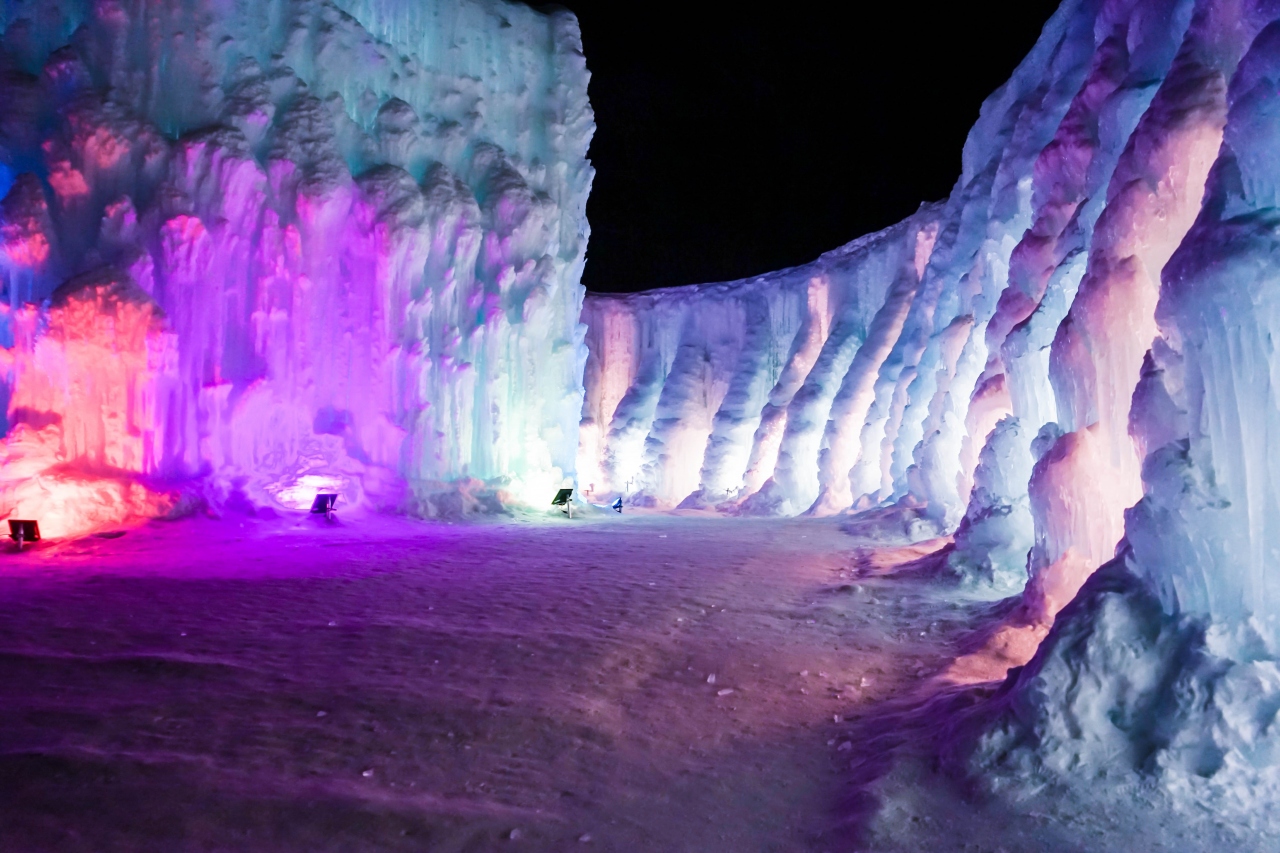 カラフルなライトで照らされた氷像は写真で見るよりもずっと綺麗で、力強く感動しました。